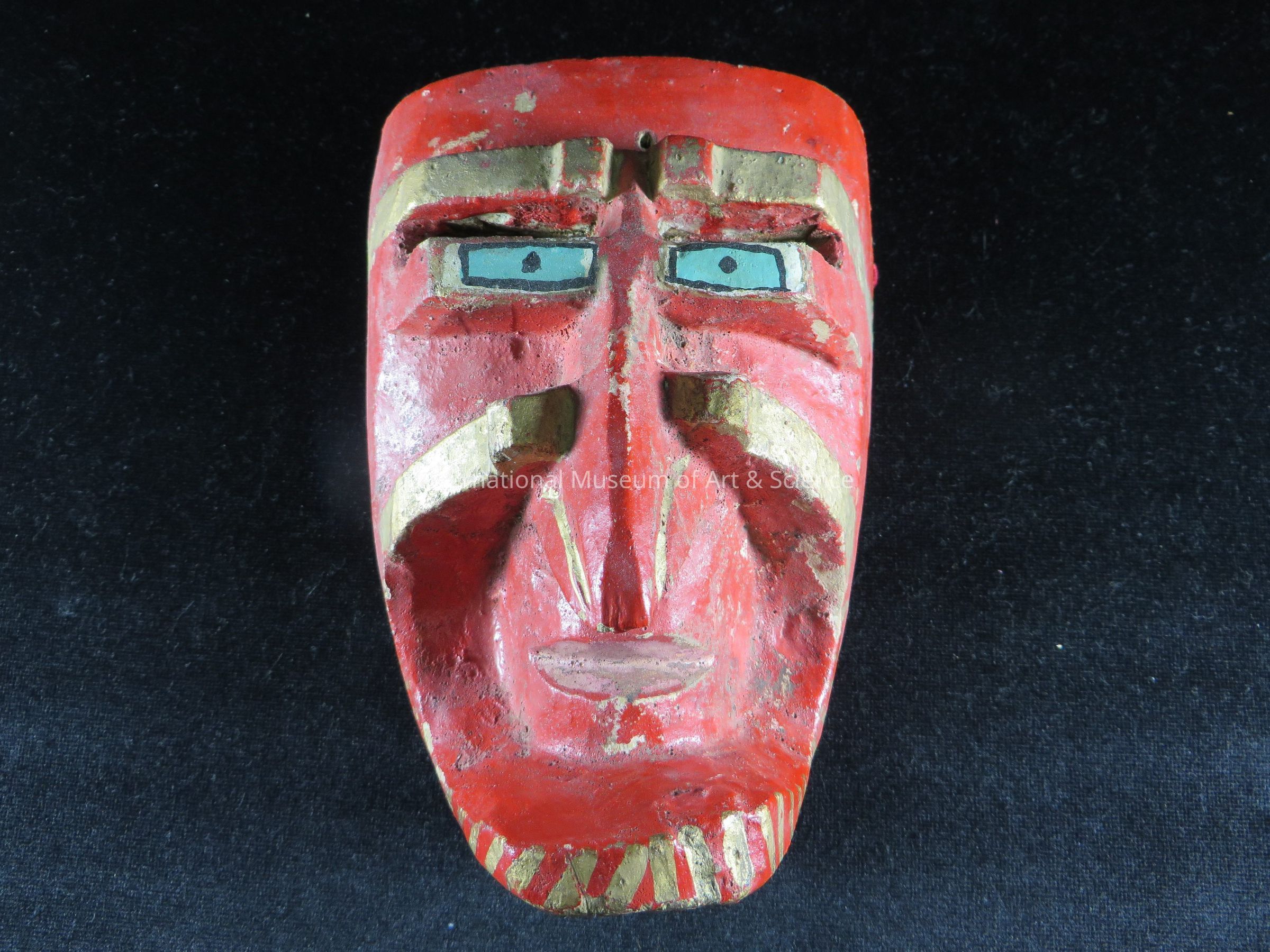 A wood carved mask. The mask depicts a human like face. The face is painted red, with a golden moustace and goatee, as well as, blue eyes with black pupils.Dimensions