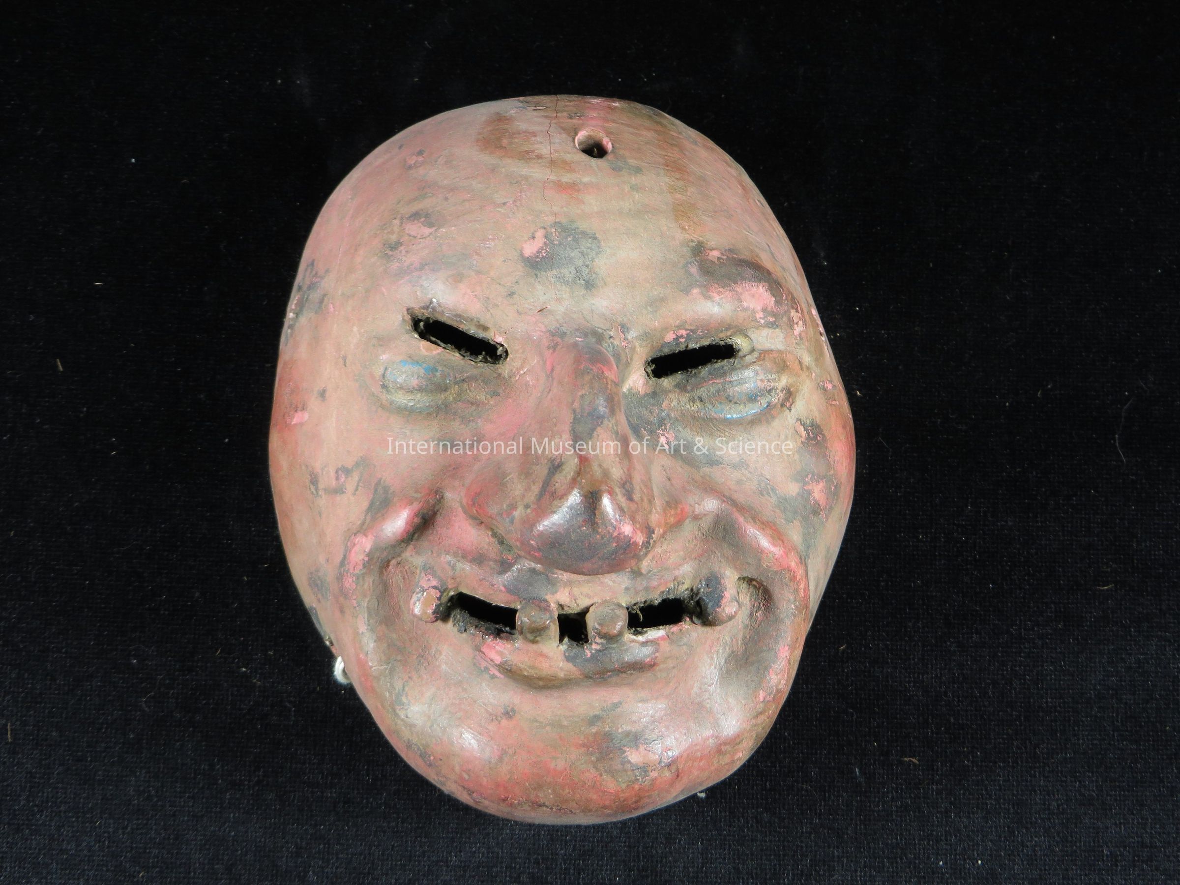 Mask. A reddish colored face; large crooked nose; slanted eye sockets; four jagged teeth, no hair; inside back cloth lined.Dimensions