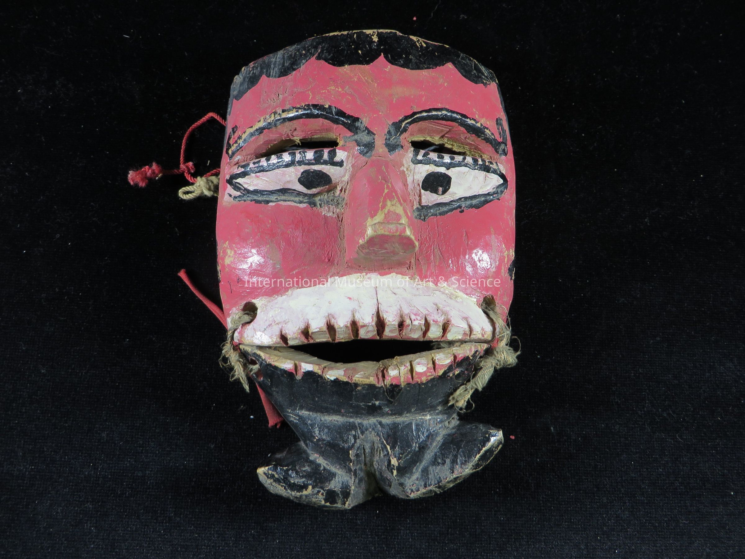 Mask. Male face painted red; white moustache; black beard; jaw hinged and movable.