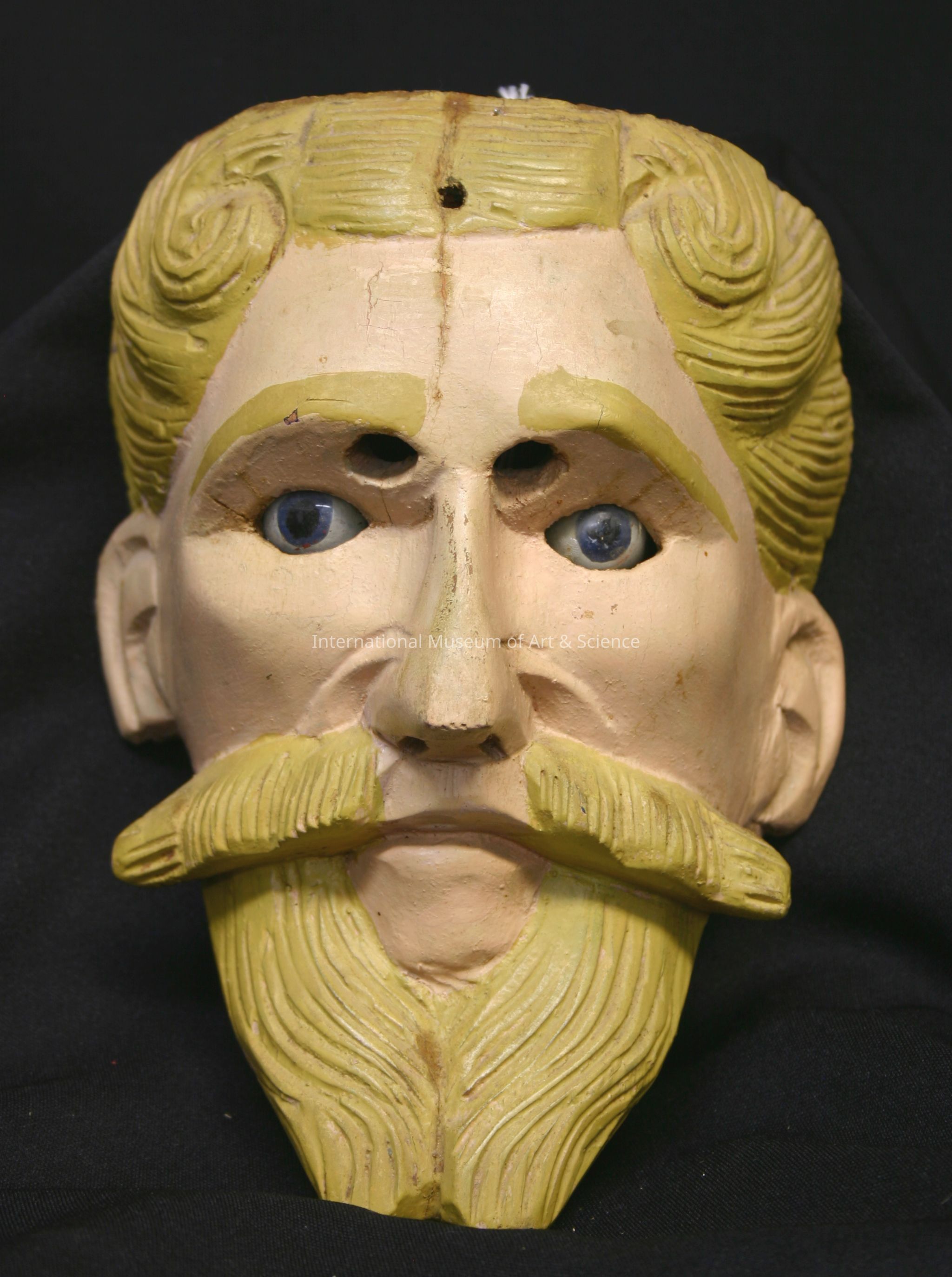 A wood carved mask. the mask depicts a man's face. The face is painted in a peach flesh color. It had a yellow carved moustache, hairline, and eyebrows. The face has blue glass eyes. There are holes carved for the wearer to see through.Artwork Details