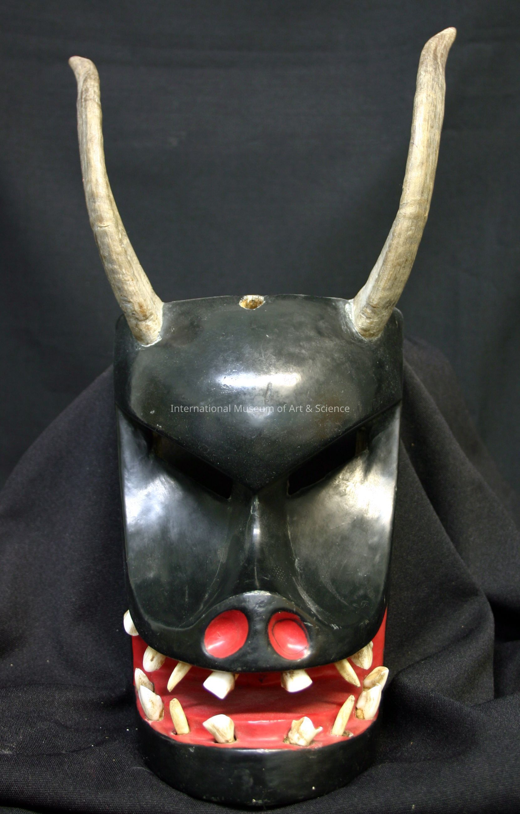 Black Devil Mask. The mask has two animal horns, red open mouth and nostrils, 16 bared teeth inserted; two holes approx. 1cm in diameter penetrate each outer edge of mask (for attaching ties for wearer); very finely finished surface, black lacquer.Artwork Details