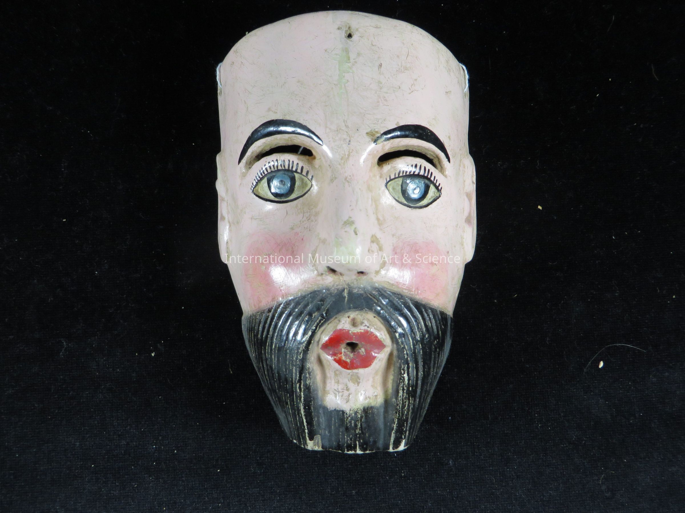 Mask. "Oriental" appearance, painted black ribbed beard, finely detailed carving, light-hued face.Dimensions