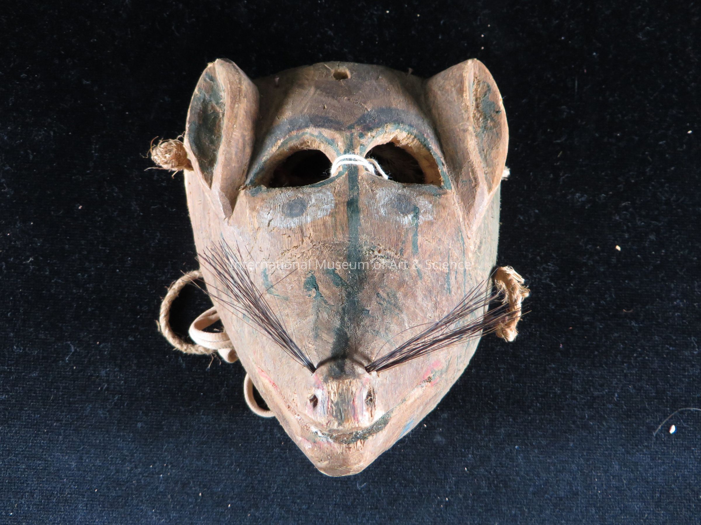A wood carved mask. The mask depicts a mouse head. The face is small and tapers down into a pointed nose. There are whiskers that protrude from the end of the face. Small details are painted on a natural wood base.Dimensions