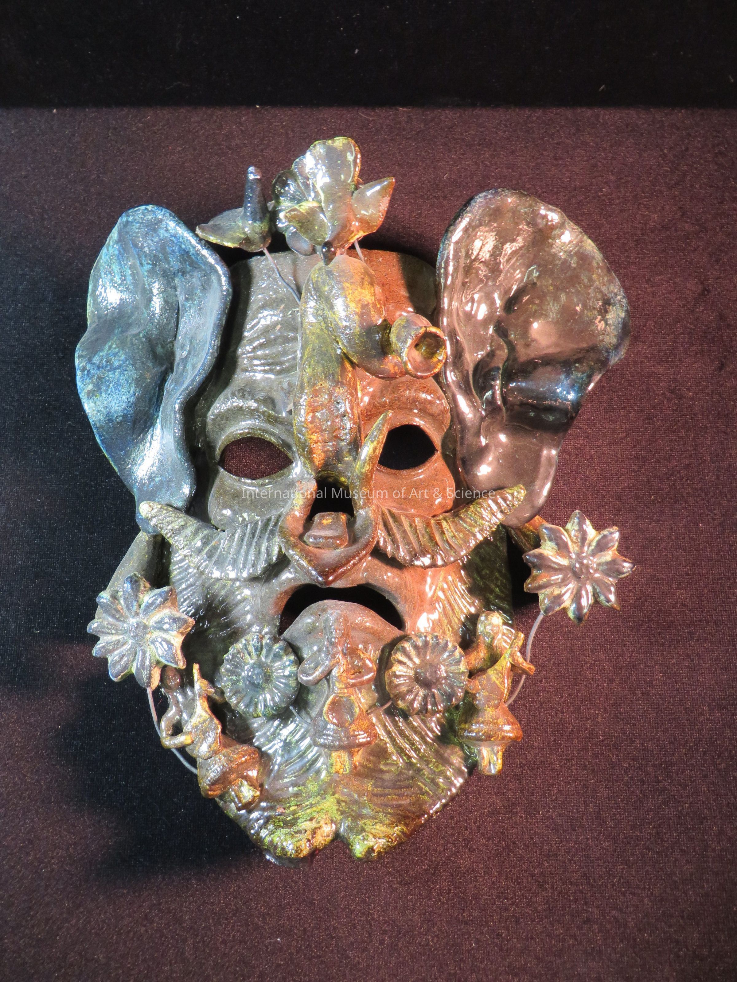 Decorative mask. Wide concave ears, like an elephant; bird and flower on forehead; bird on trunk like nose; tusk under nose; leaf-like moustache; beard of flowers and three figures playing musical instruments; pear shaped earrings; oval eye openings and open-dropping mouth.Dimensions