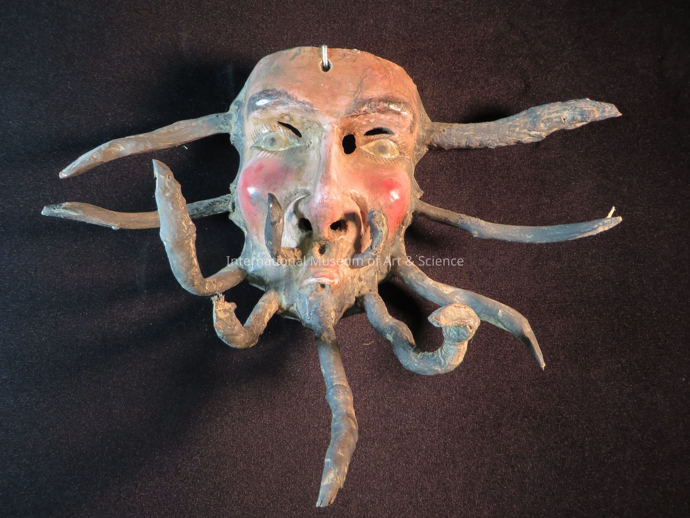 Decorative Mask. Carved wood with finely-featured face, black pointed branch projectiles as moustache, rosy cheekbones; large nose with open nostrils; open slits above eyes.Dimensions