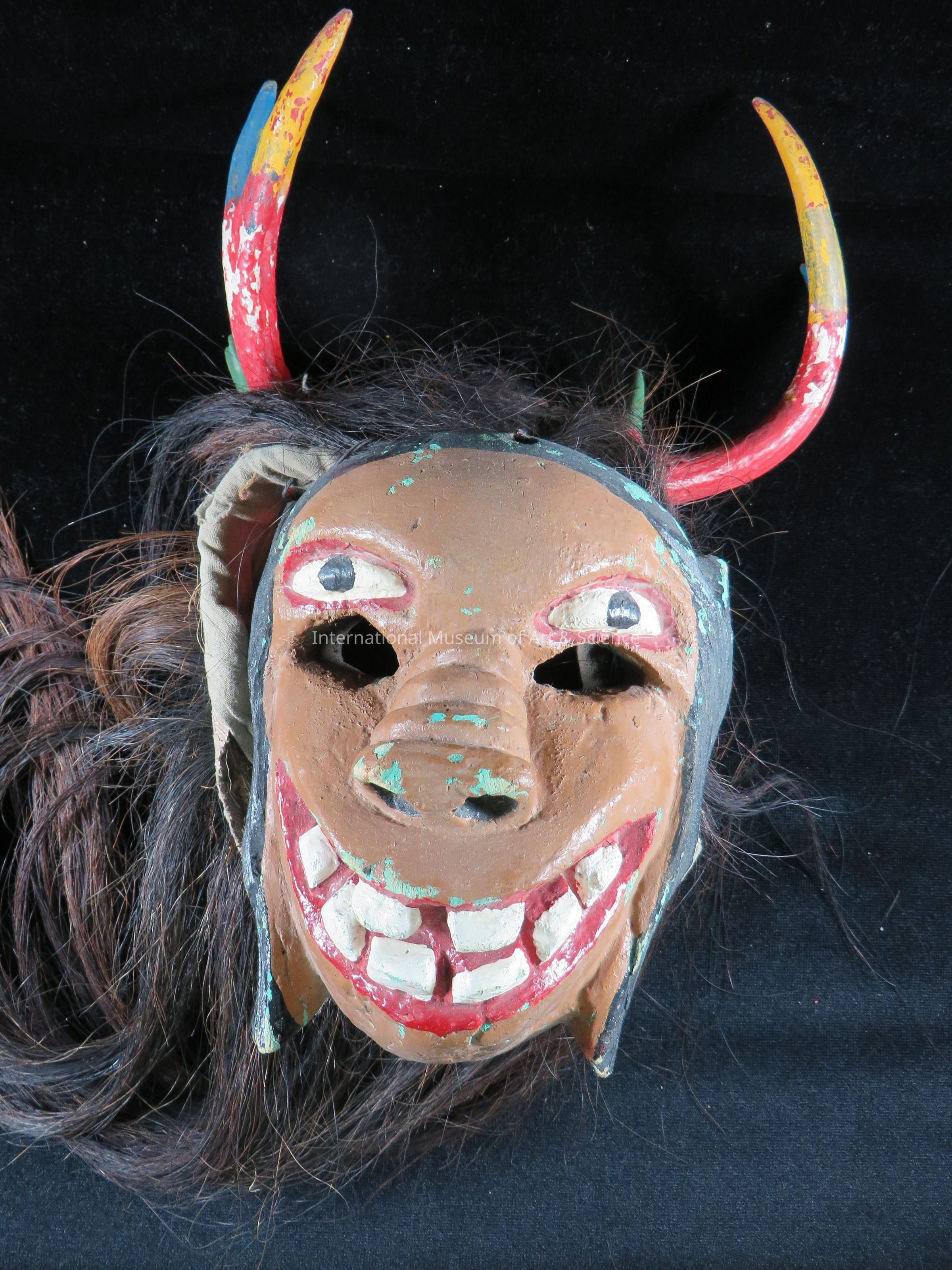 Mask. Brown face, bared feet, wrinkled nose; Horse hair headdress. Antlers attached.Artwork Details