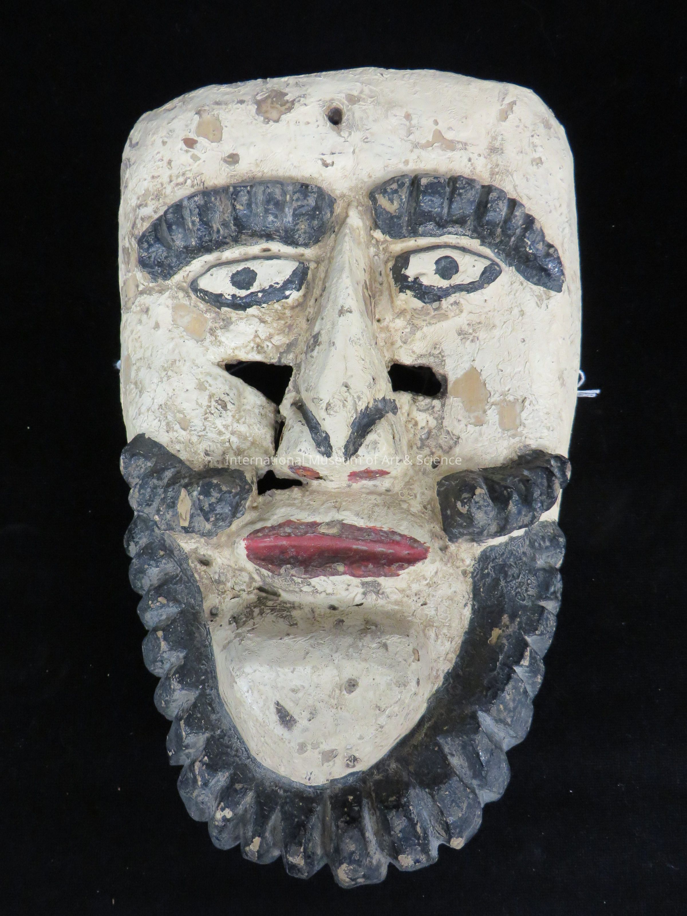 Mask. Light colored face - heavy eyebrows, divided moustache, beard.