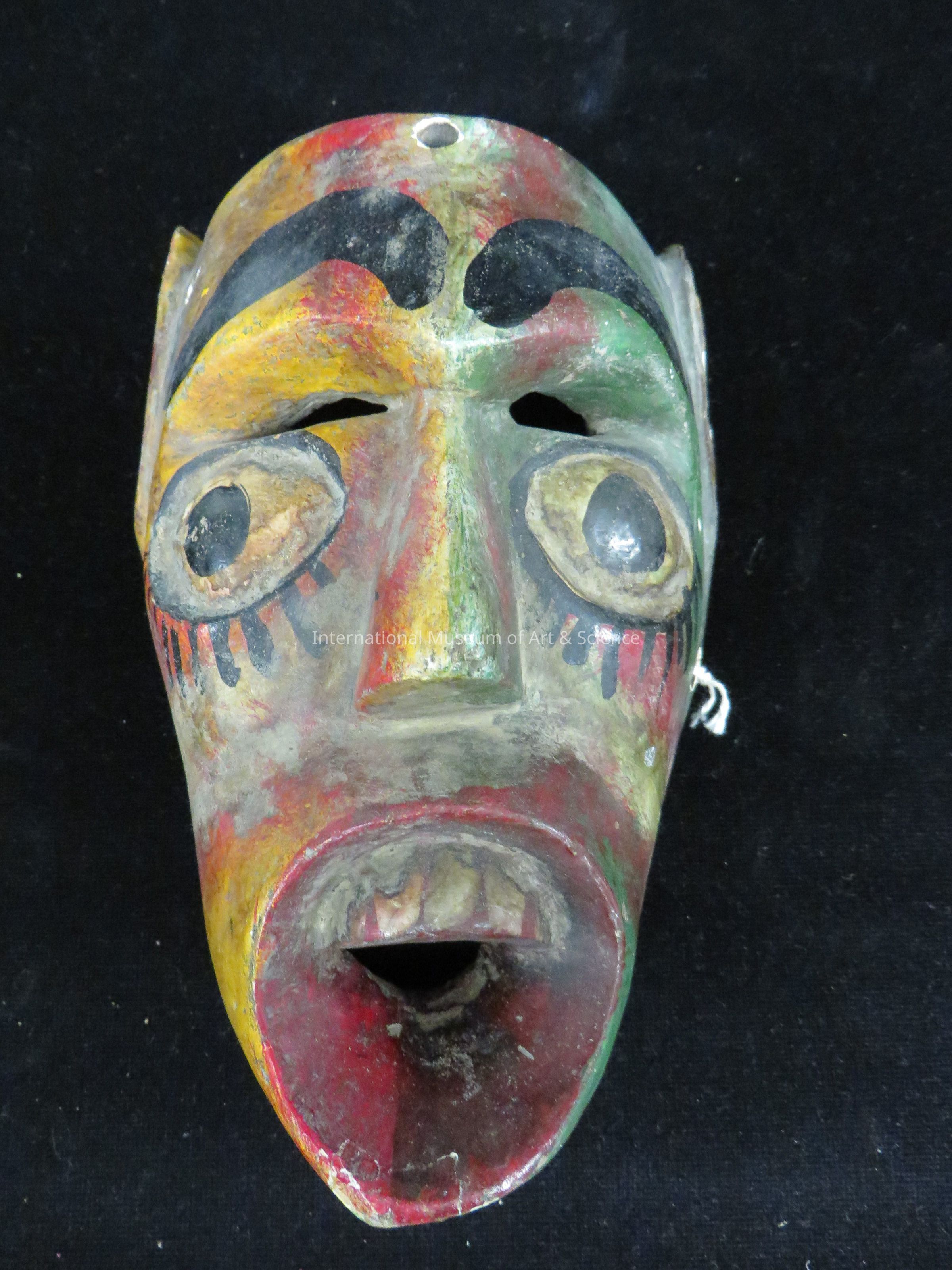 Decorative Horned Mask. Horned mask; multi-colored; concave ears; wide eyes ainted black and white; pointed nose; mask painted red green, black, white and orange.Dimensions