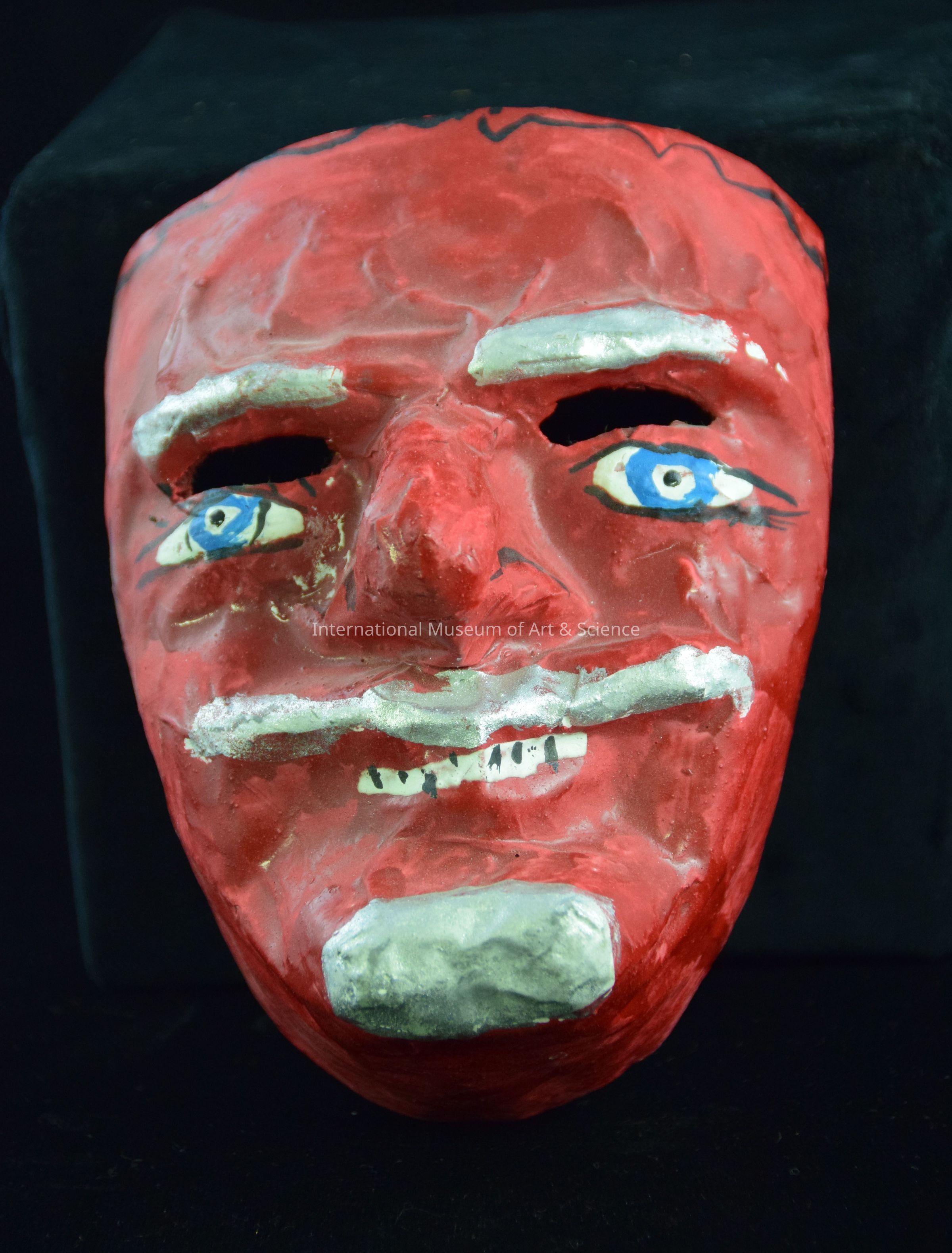 A papier-mache mask. The mask depicts a man's face. The overall face is painted red, with silver eyebrows, moustache, and goatee. The eyes are blue and the mouth is smiling, showing teeth. There are holes between the eyes and eyebrows.Artwork Details