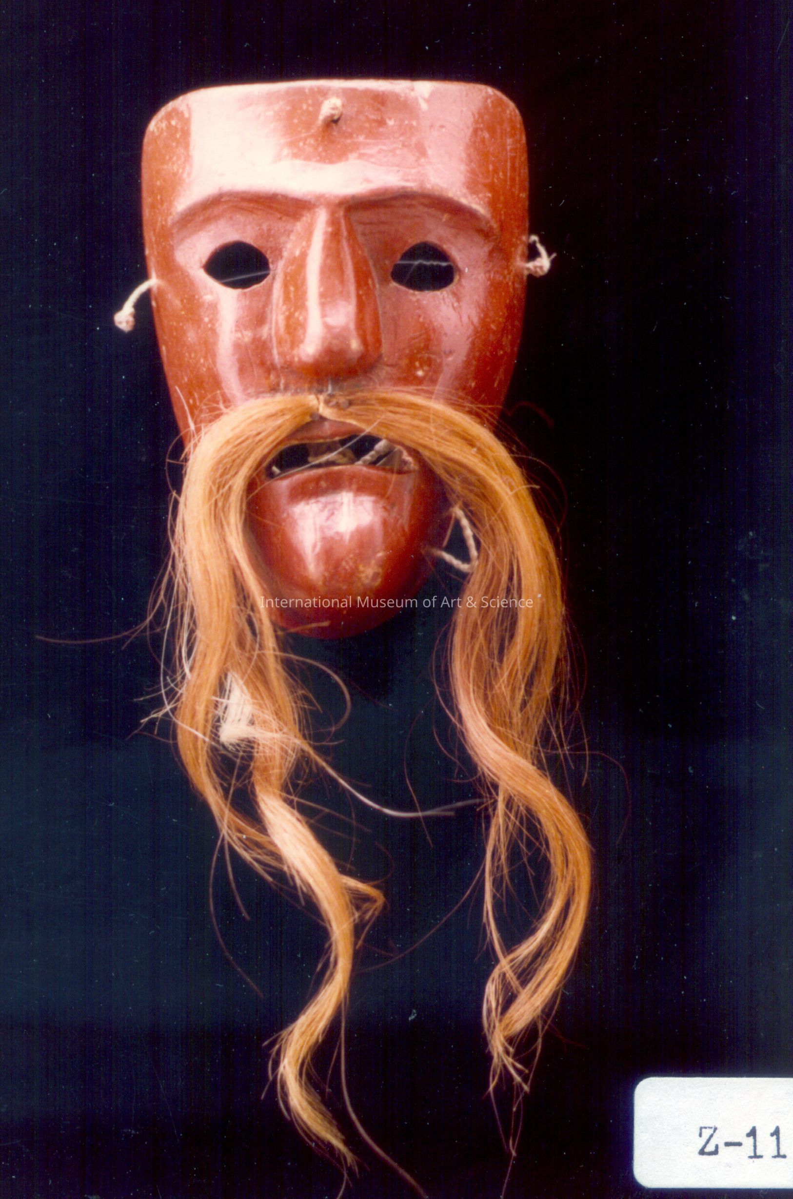 Mask for Tastoanes Dance. Zacatecas Mexico. Wood, paint, animal hair. Wood painted terra cotta color; long red moustache with some blonde hairs nailed on; mouth openings. 8" x 5 3/4" (20.3cm x 14.6cm)
