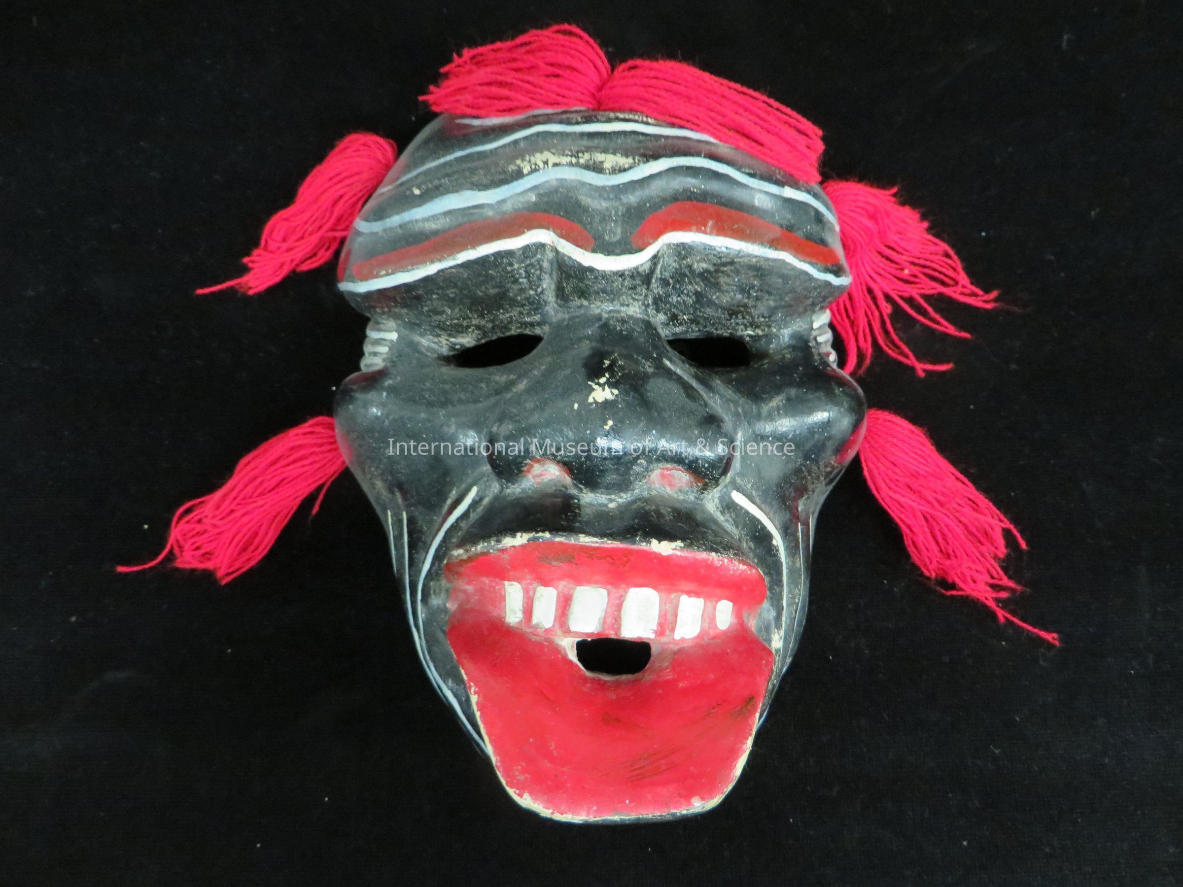 (Negrito) Mask. Black face, red and white stripes, large red mouth; openings at eyes, nose and mouth; teeth carved and painted on mouth.Dimensions