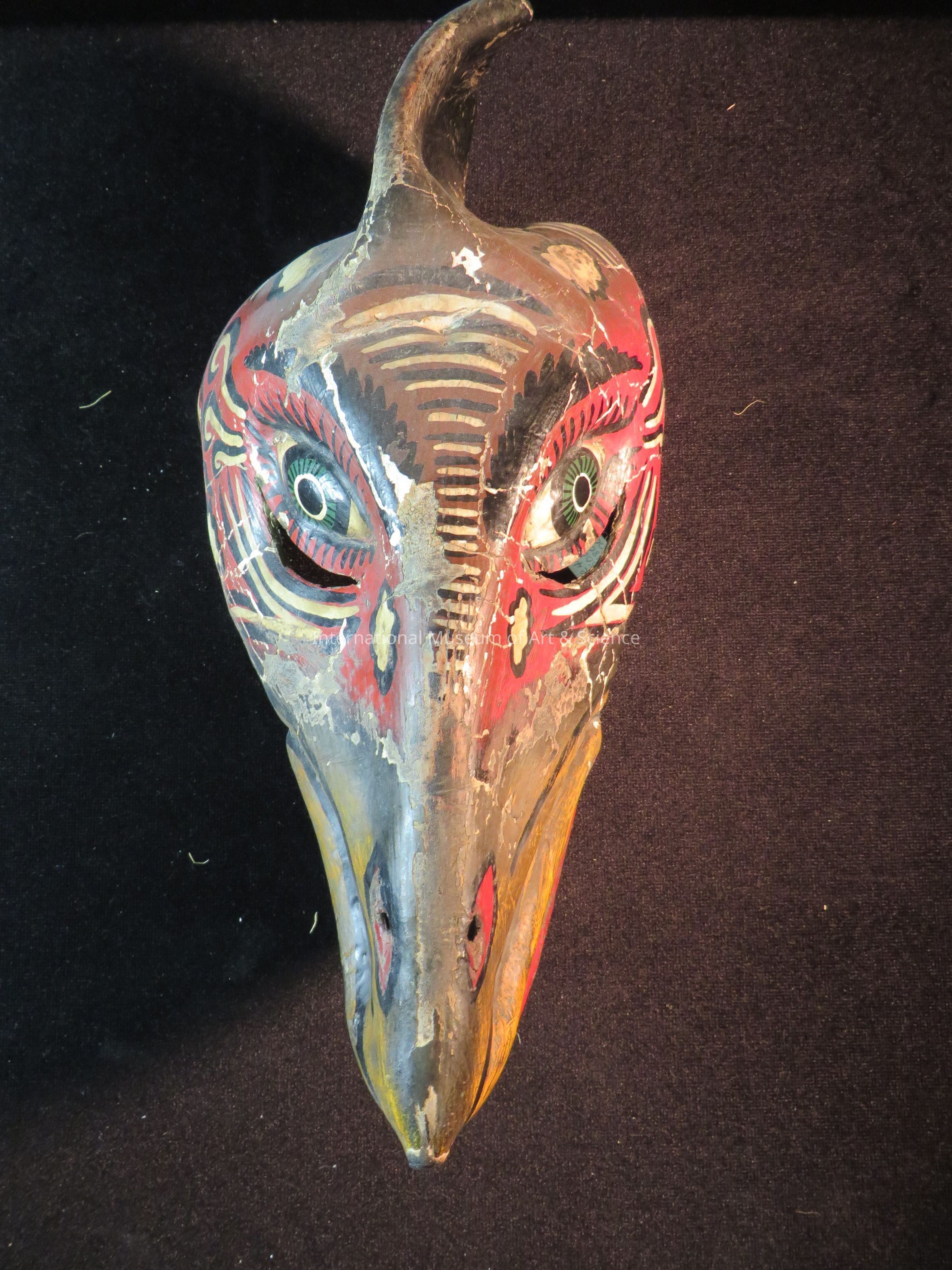 Decorative Bird Mask. Leather cord at folds; curved black leather at top: black/ white stripes between green eyes; linear and spot designs.Artwork Details