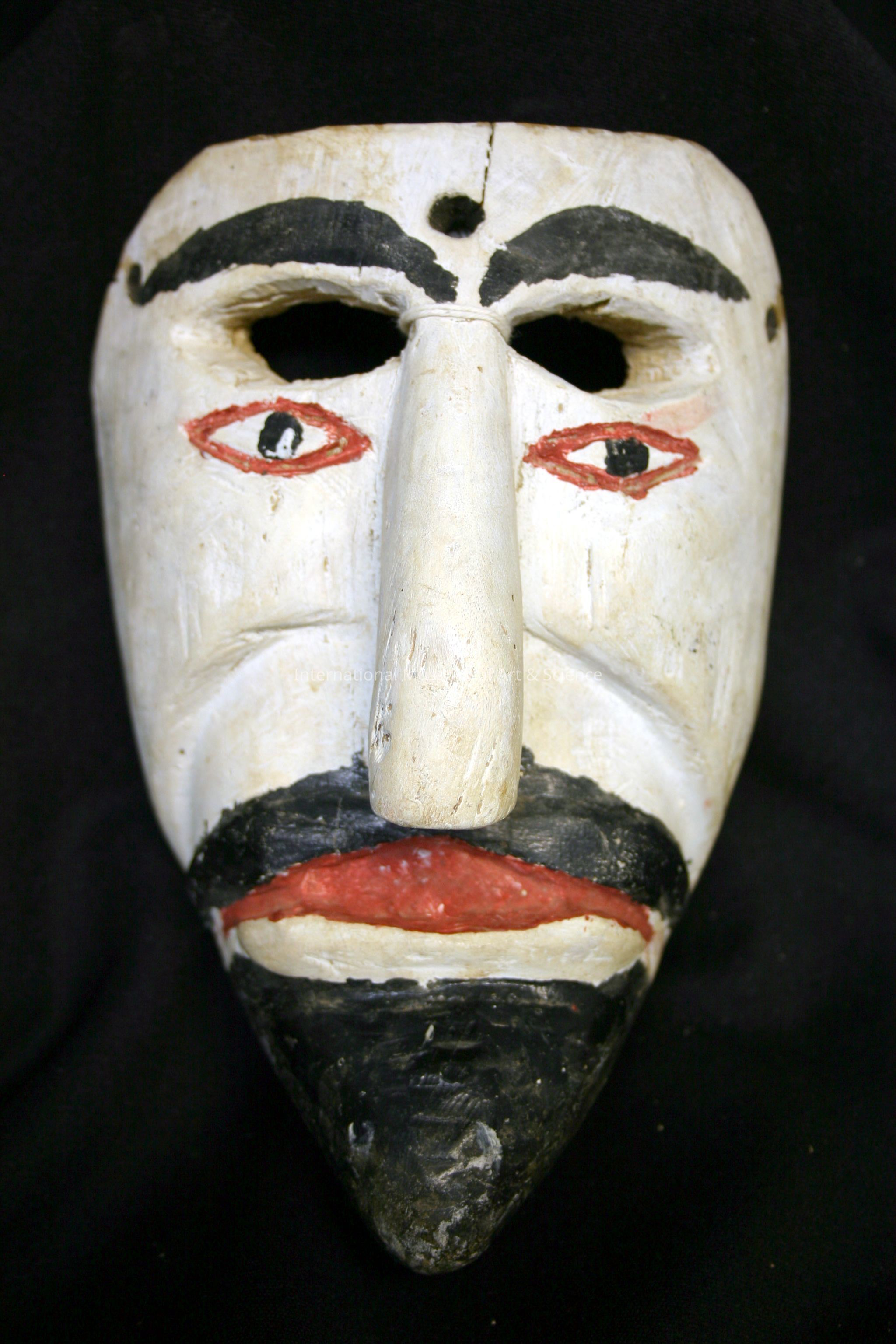 Mask. Beige flesh color man mask; long nose; black painted eyebrows and moustache; red oval eyes and mouth; protruded pointed chin beard.Made/Created
