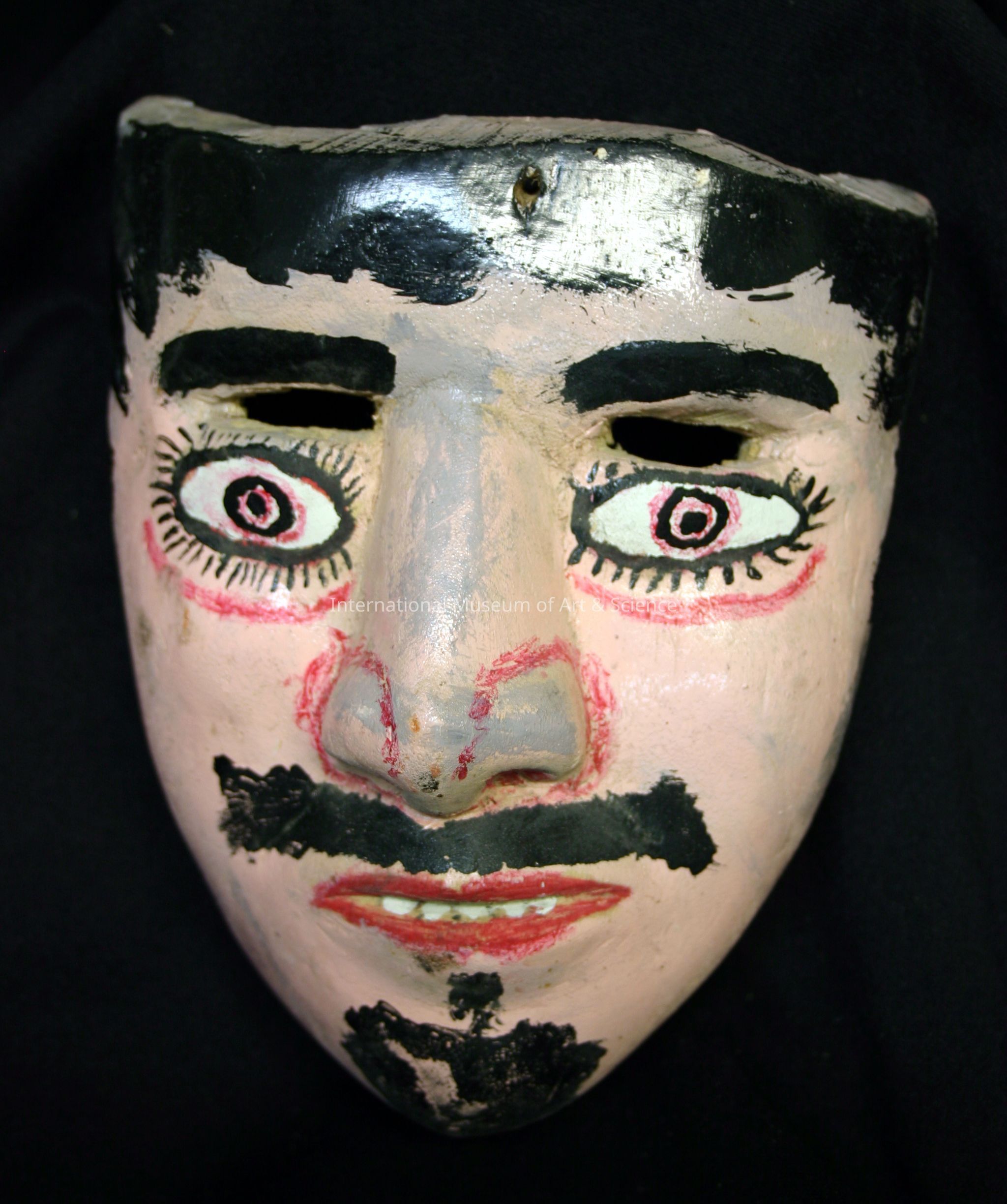 A wood mask. The mask shows a man's face. It is painted with a pink flesh color, black facial hair, and red detailing to the eyes, nose, and mouth. The mask depicts an Ixtlaclacatl man.Made/Created