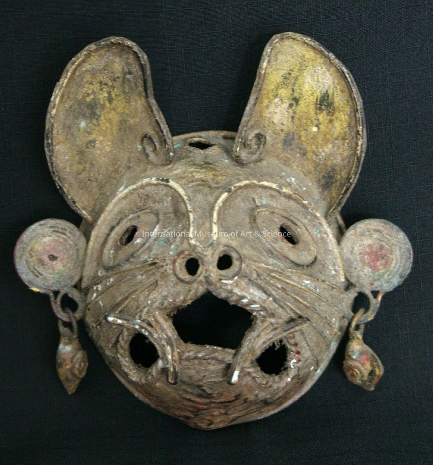 A small animal face mask, possibly a mouse or rat. The mask is a hemisphere form. There is a pair of ears, wired whiskers and teeth. There is a downward cresent opening for the mouth and round holes for the nostrils and eyes. Under each ear are earrings with pieces that dangle. The piece was once colored with red and yellow paint.Made/Created