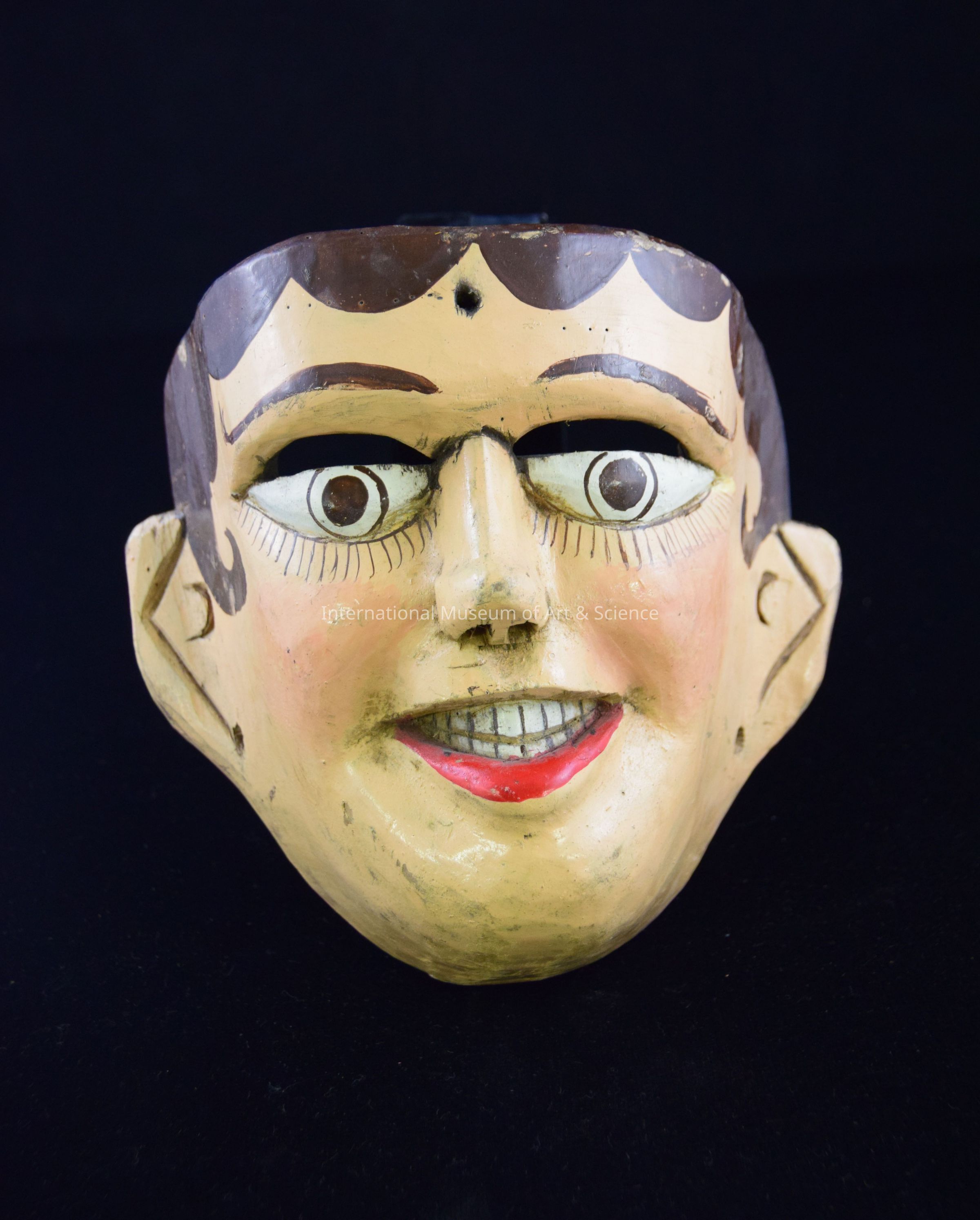 A wood carved mask. The mask depicts a humanoid face. The face is painted a flesh tone with rosey cheeks. The face has large eyes with brown pupils and long eye lashes. The mask has a small pointed nose and an open mouth showing teeth, with the lower lips painted red. The face's hair is painted brown and is in stylized curls.Dimensions