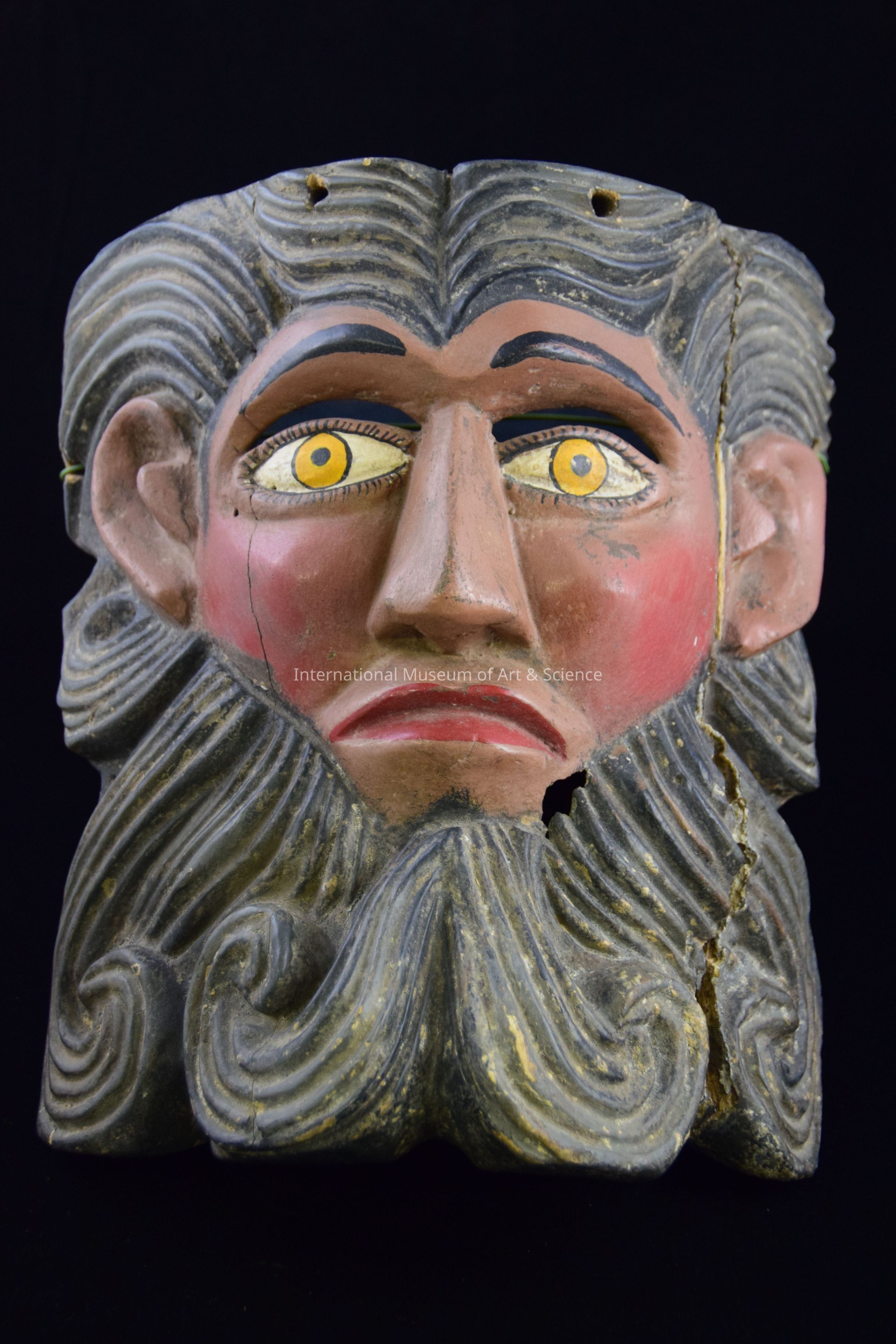 A large wood carved mask. The mask depicts a male face. The face skin is painted a deep tan, with rosey cheeks, red lips, and gold eyes. The man's hair and beard are carved and panted black. There are slits carved between the eyes and eyebrows for a wearer to see through. The face is non-expressive.Dimensions