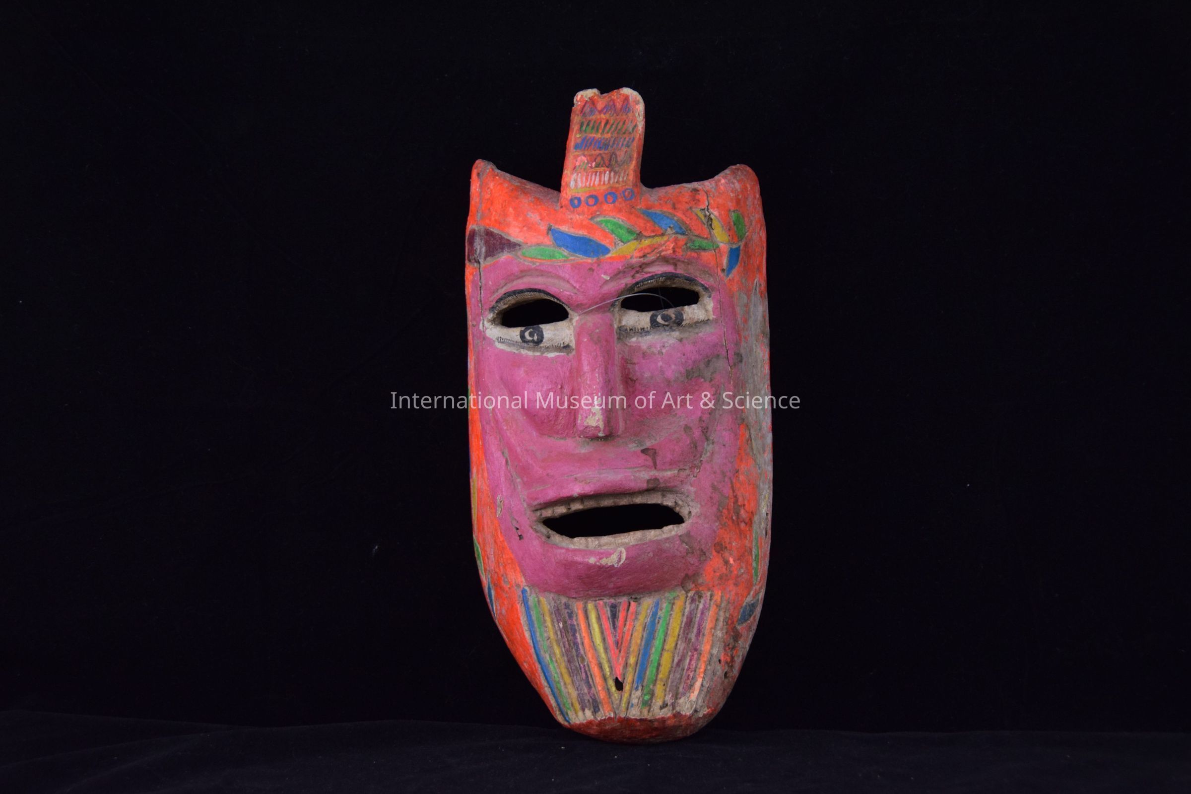 Wooden mask- painted brightly in multi neon colors. Face is in pink,surrounded by a neon orange color. Beard is painted in strips of neon blues,greens,oranges,pinks,yellows,purples. Along sides of face and across forehead there is a vine with leaves painted yellow,blue,green. Above forehead is a small crown painted w/ strips,zig-zags,and circles in mutli colors.Mouth is open and shows small rows of teeth.Dimensions