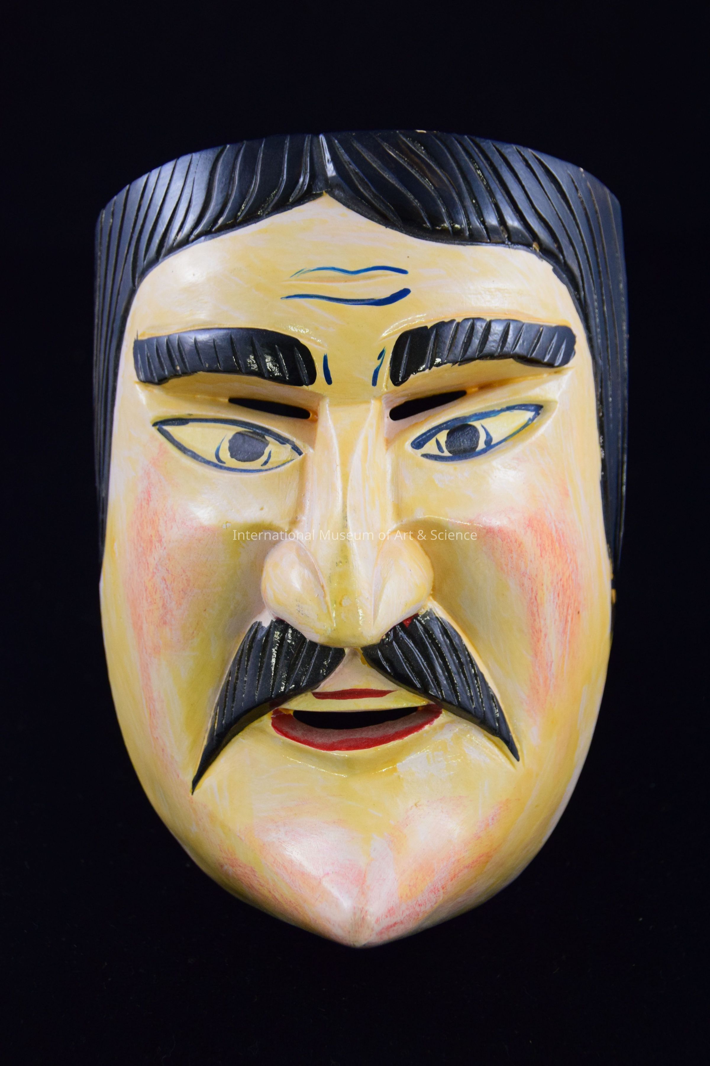 A wood carved mask. The mask depicts a man's face. The face is painted in a light flesh tone with rosy cheeks. The man's eyebrows, hair, and moustache are all painted black. The face has a large nose with red nostrils, and a pointed chin. The entire piece has been varnished. This piece is probably on decorative, and never used in a dance.Dimensions