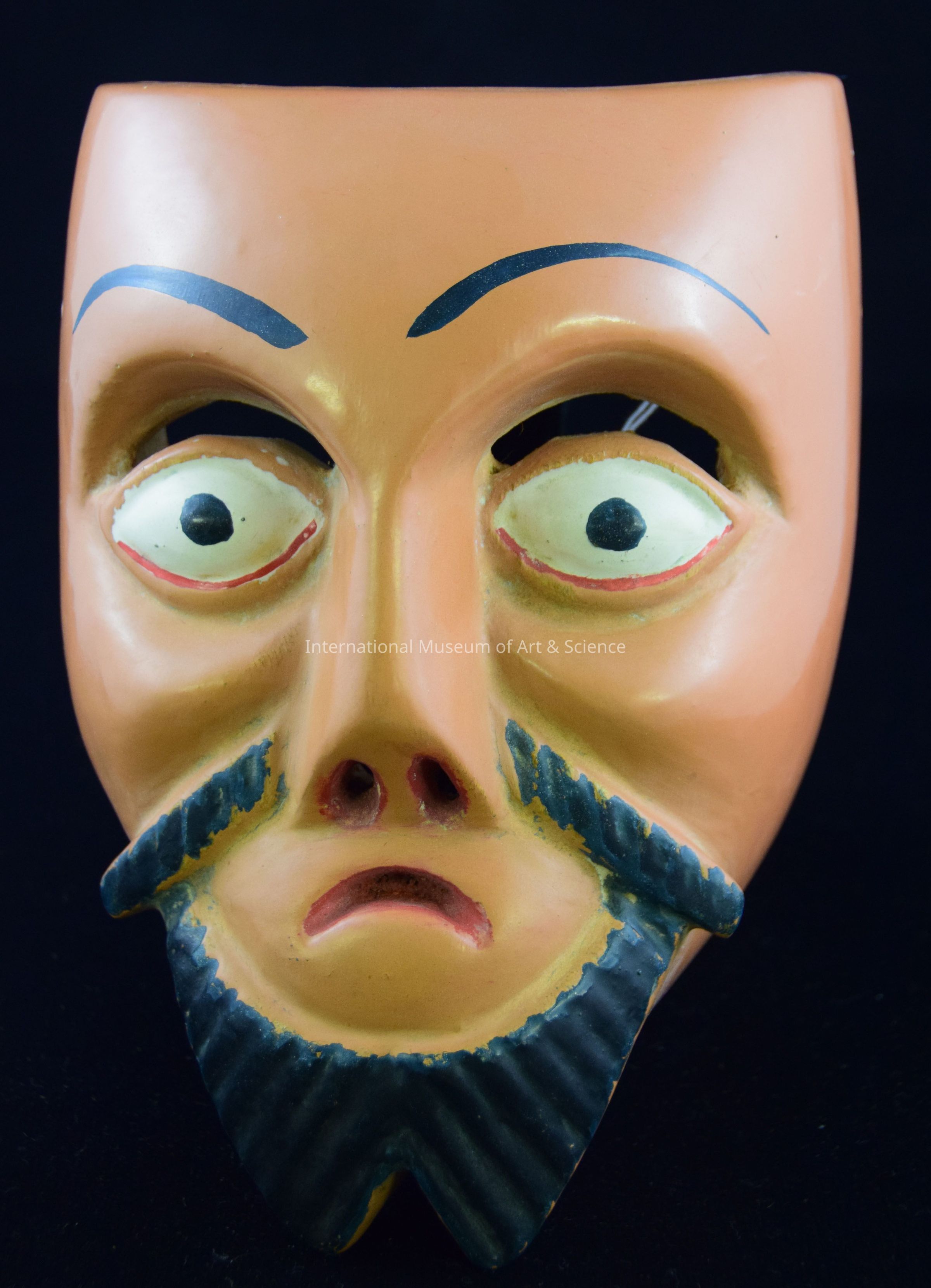 A wood carved mask. The mask depicts a male face. The face is painted a tan skin tone, with large white eyes with small black pupils. The face has a black mustache and black beard, a small frowning mouth with thin red lips.Dimensions