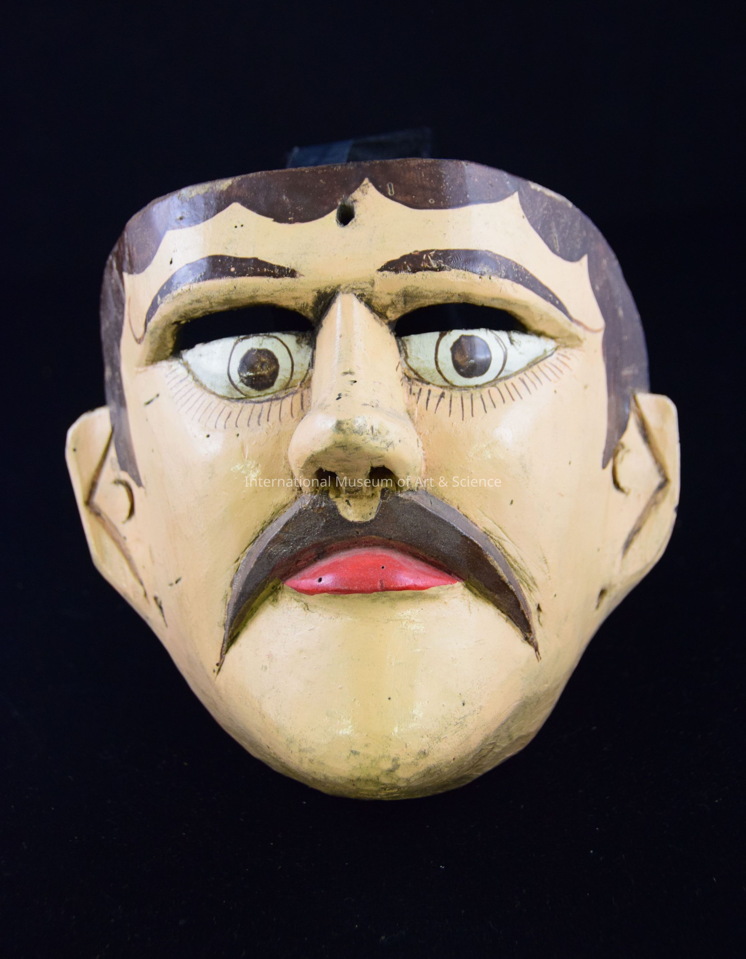 A wood carved mask. The mask depicts the face of a man. The face is painted in a flesh tone with large eyes with brown pupils, and long eye lashes. The nose is short with a pointed end. The mouth is in a slight frown with red lips. The face has brown hair, moustache, and eyebrows. There are slits carved above the eyes for a wearer to see through.Dimensions