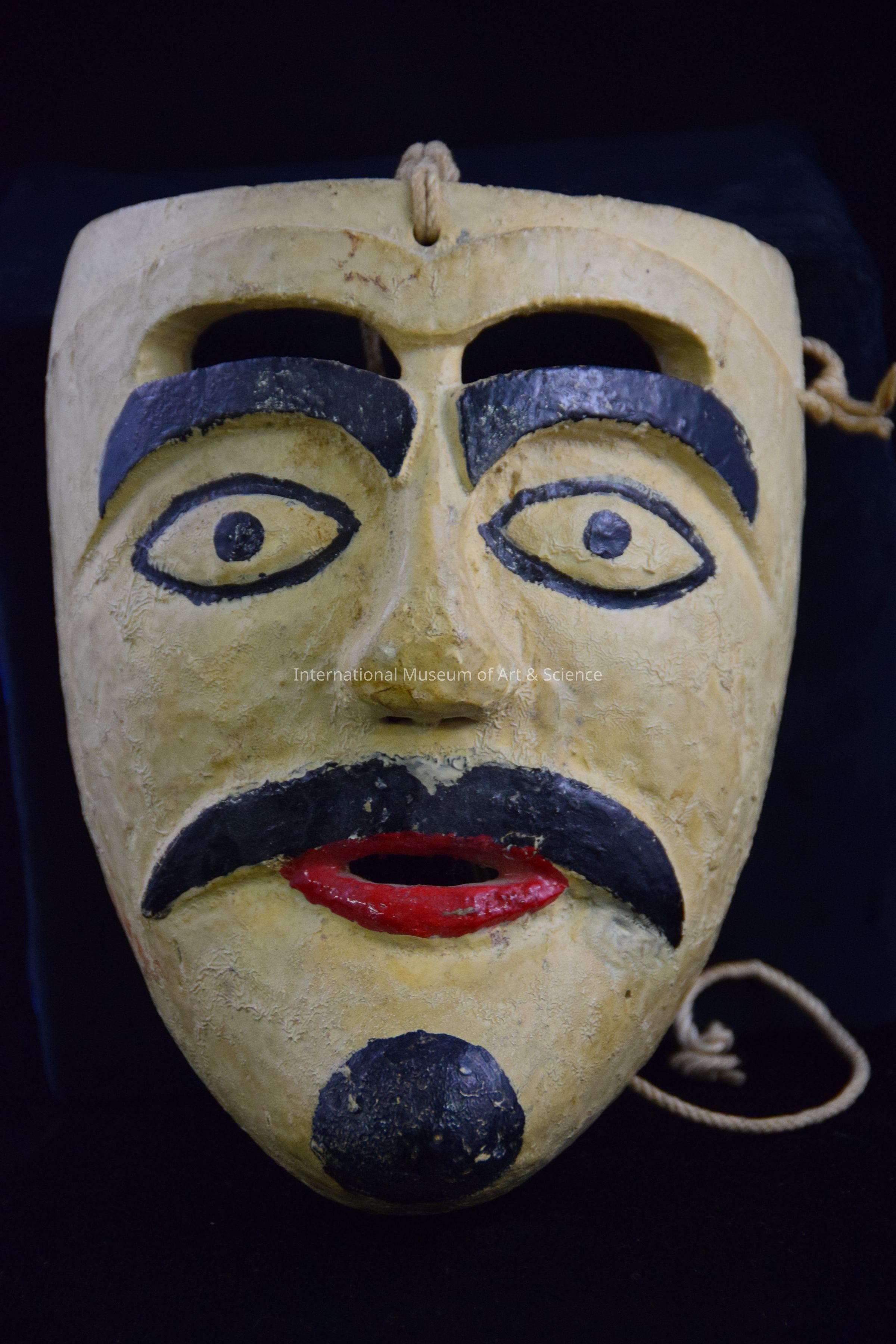 A wood carved mask. The mask is of a man's face. The skin is painted a white/yellow, with wide white and black eyes, red lips, and black eyebrows, a moustache, and goatee. A cotton string is attached to secure the mask to a wearer's head. There are slits carved above the eyes and in the mouth of a wearer to see and breath through. Two metal eye-hooks and a wire have been attached to the back for hanging.Artwork Details