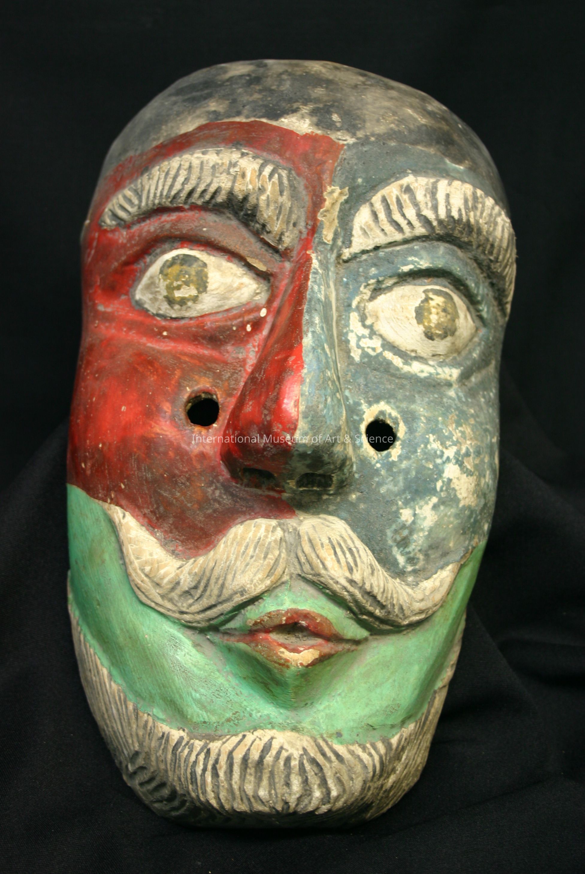Male Mask painted red on the left side, blue on the right and green between mustache and beard. Holes carved each side of nose so wearer can see.Dimensions