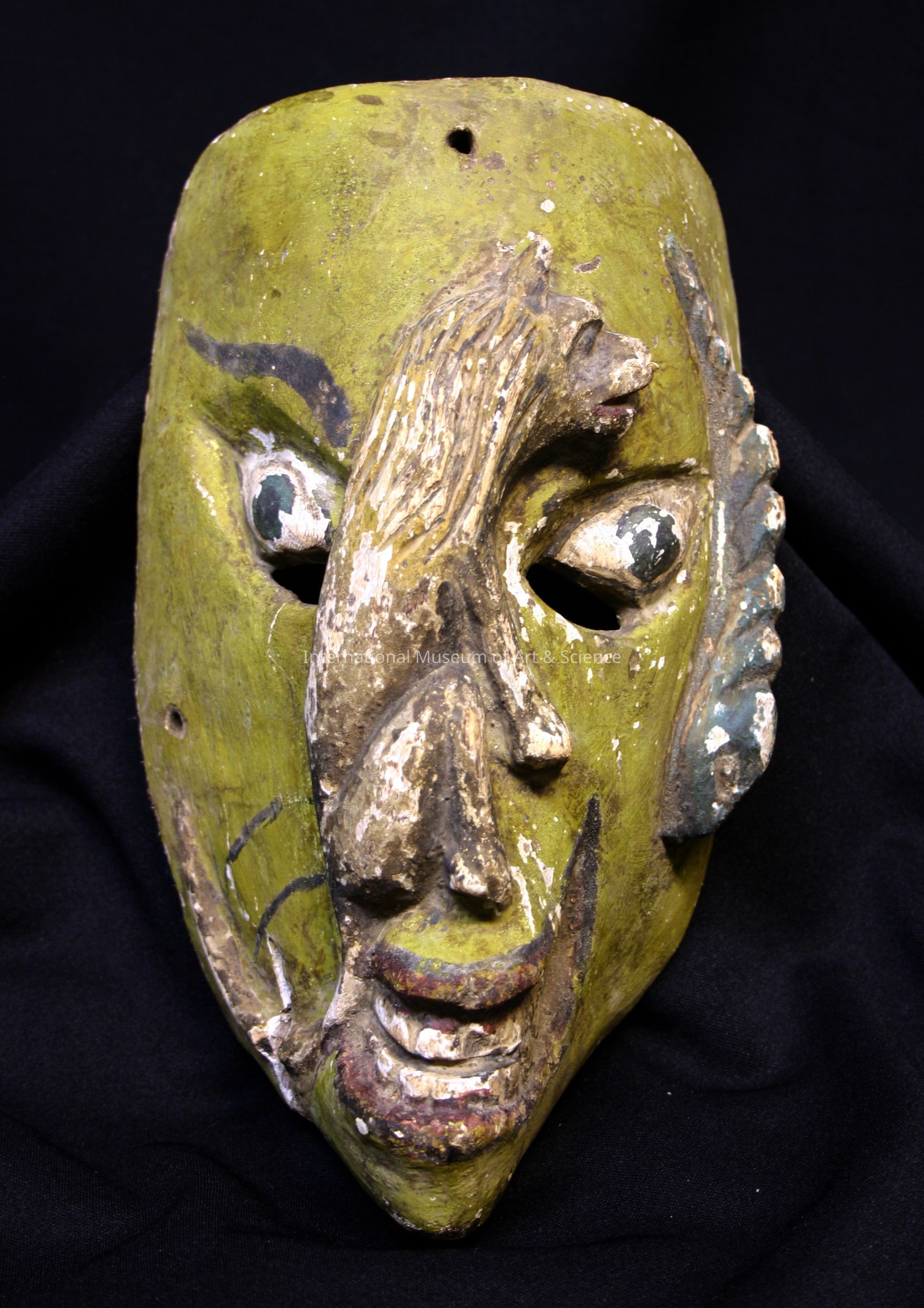 Seven-vice mask; yellow-green human face with brown lion on top of nose, a blue snake (or worm) on the right side. Eye slits are carved under each eye.Artwork Details