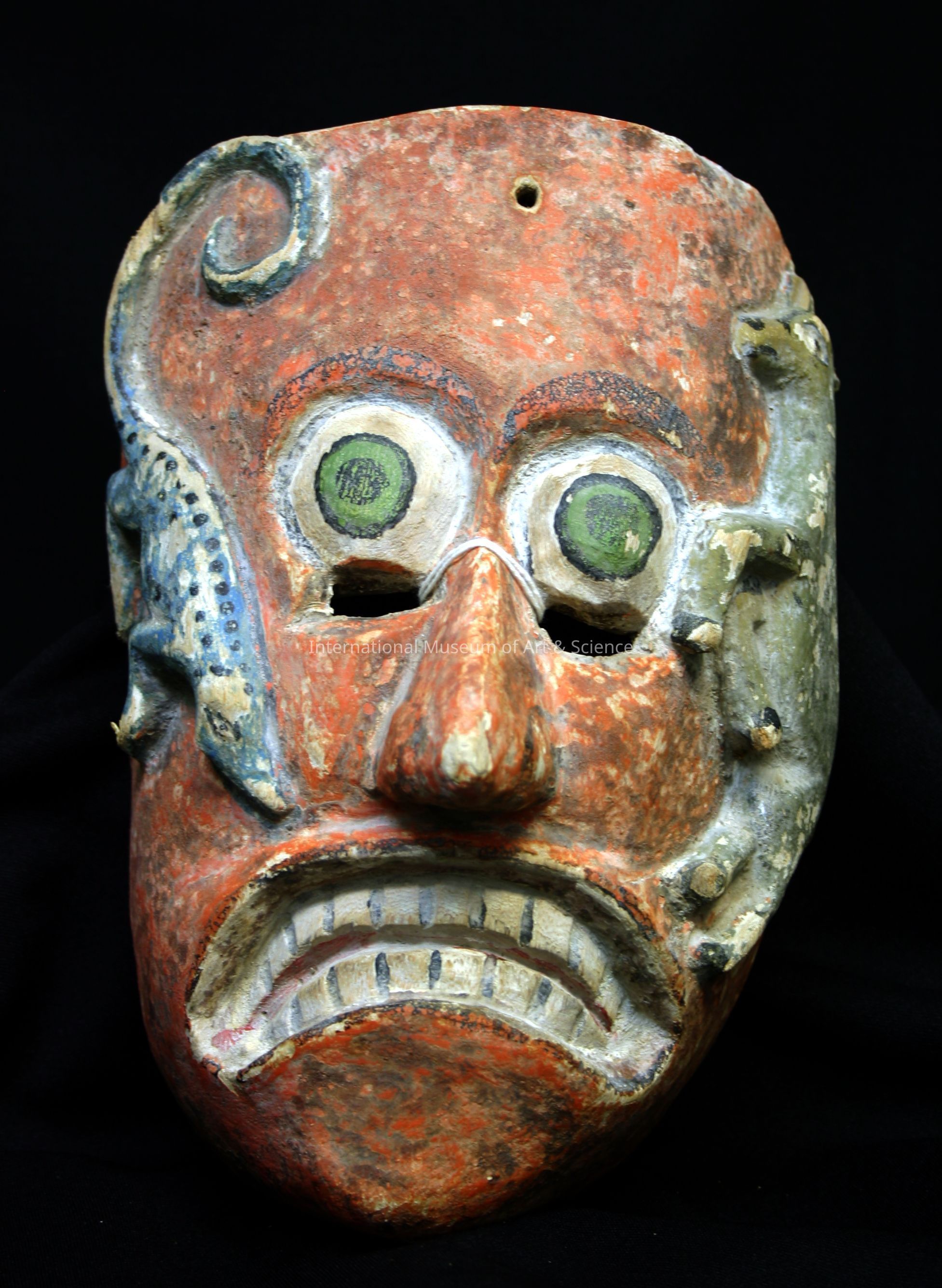 Seven vice mask, orange man's face w/ lips curving downward, a brown deer on the right and a blue lizard on the left eye slits are carved beneath the eyes.Artwork Details