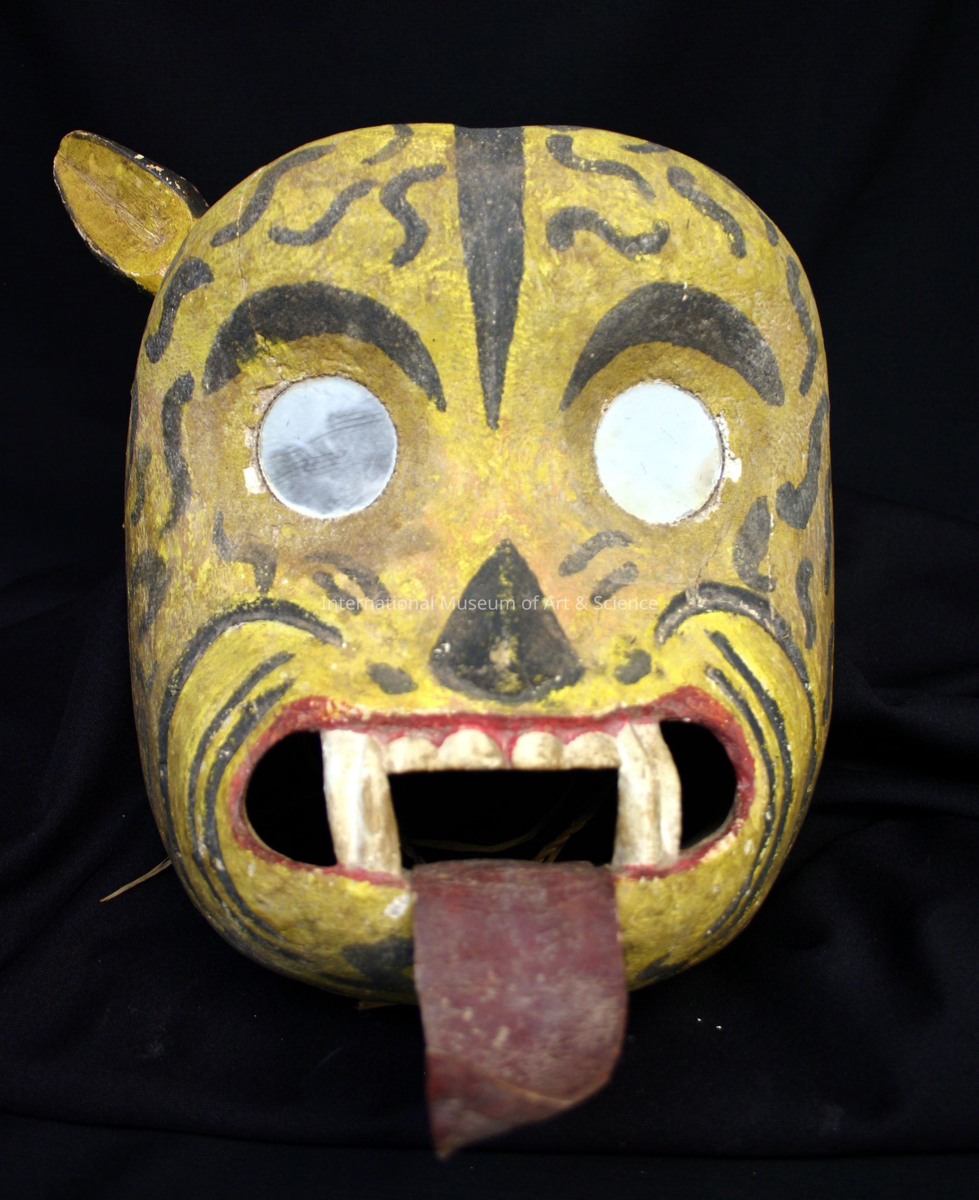A tigre or jaguar mask. The mask is carved from wood. The eyes are mirror shapes disks. The mask is painted yellow with black highlights on the nose,eyebrows & dimples. It has white teeth,a red mouth, and a leather tongue that is painted. Due to mirrored eyes, wearer must look through mouth.Artwork Details