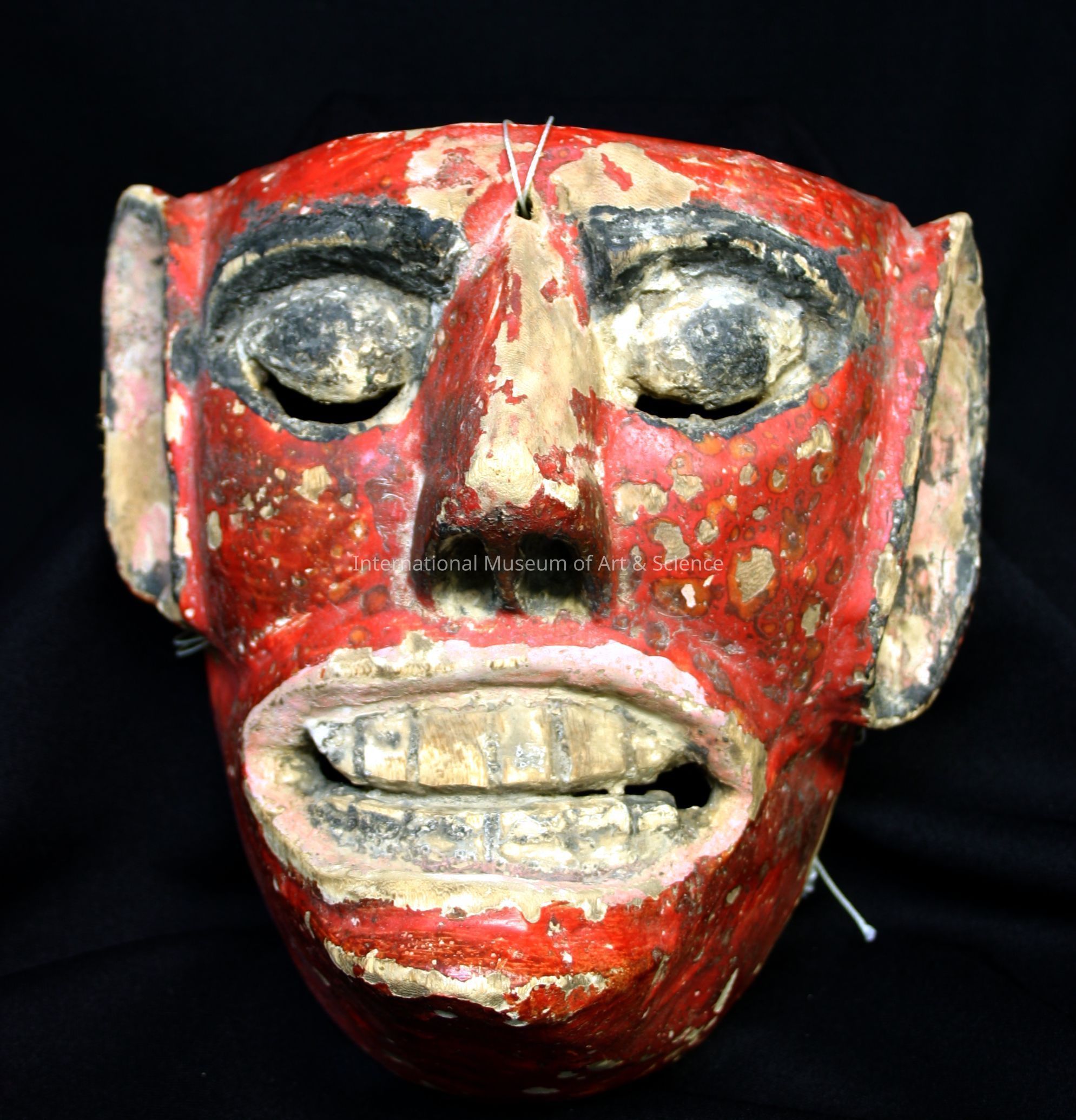 Red devil, man with pointed ears with tint of pink inside, black eyes and brown ears, pink on lips and ears, a large sinister grin. Interior of mask crudely gouged. Eyeslits located under the eyes.Dimensions