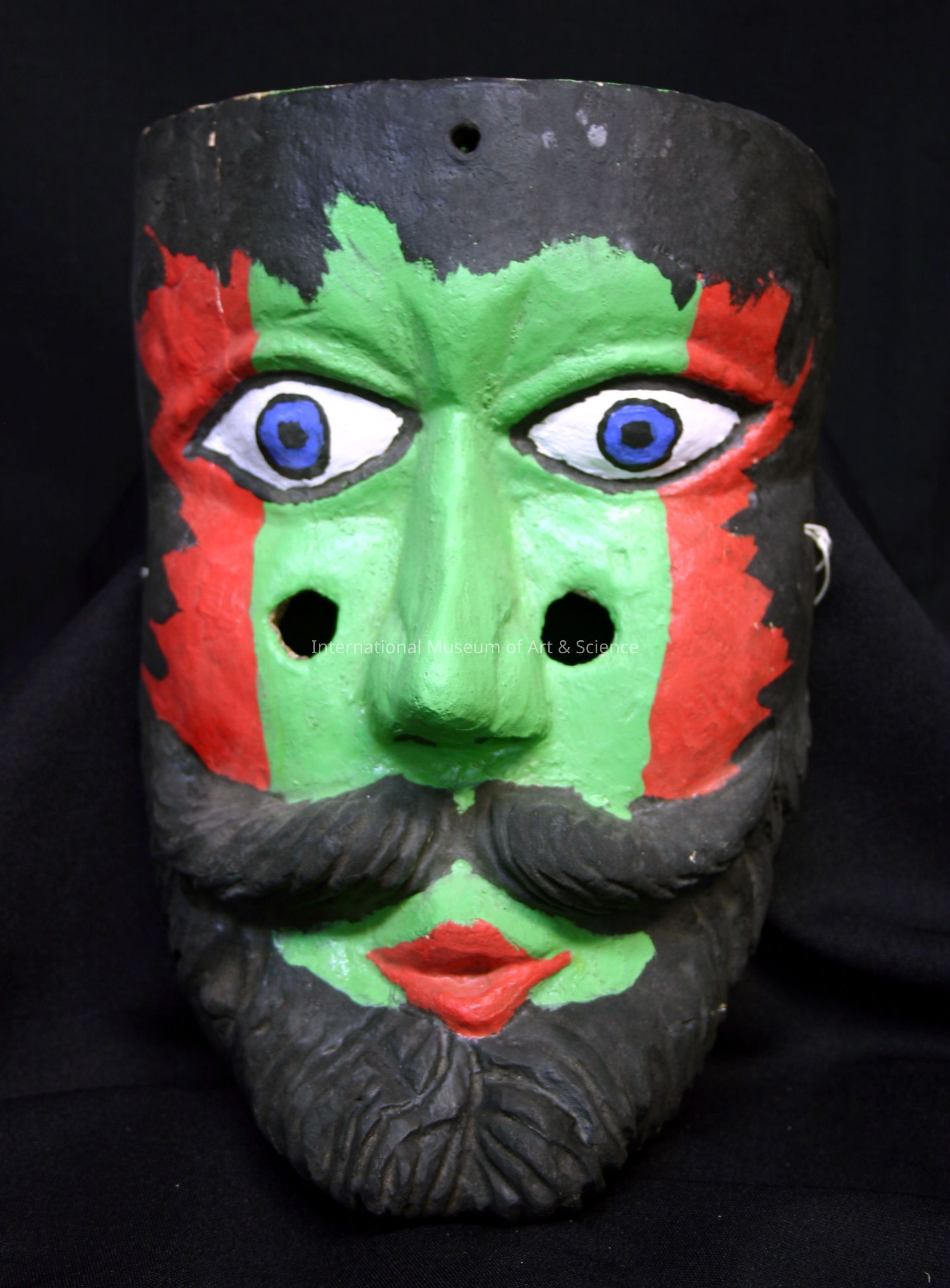 Mask; Mexican. Carved wooden mask; bearded mustahoied. Black with green and red paint, blue eyes. Piece chipped from face at top of edge.