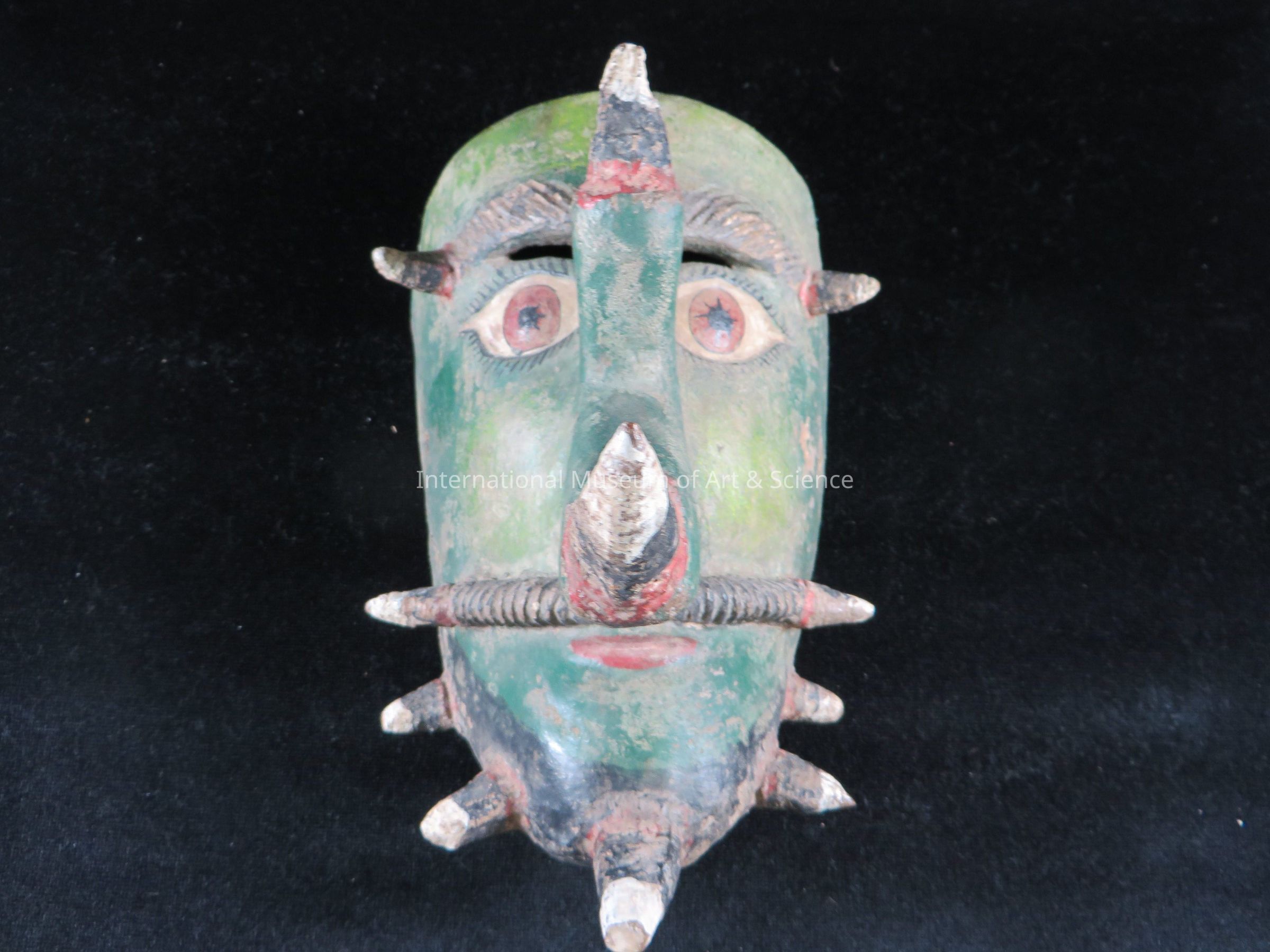 A wood carved Caiman or alligator mask. The mask mixed human and zoomorphic features. There are many wood spines that protrude from the face of the mask. The mask is painted green with the spines in black and some detailing in red.Dimensions