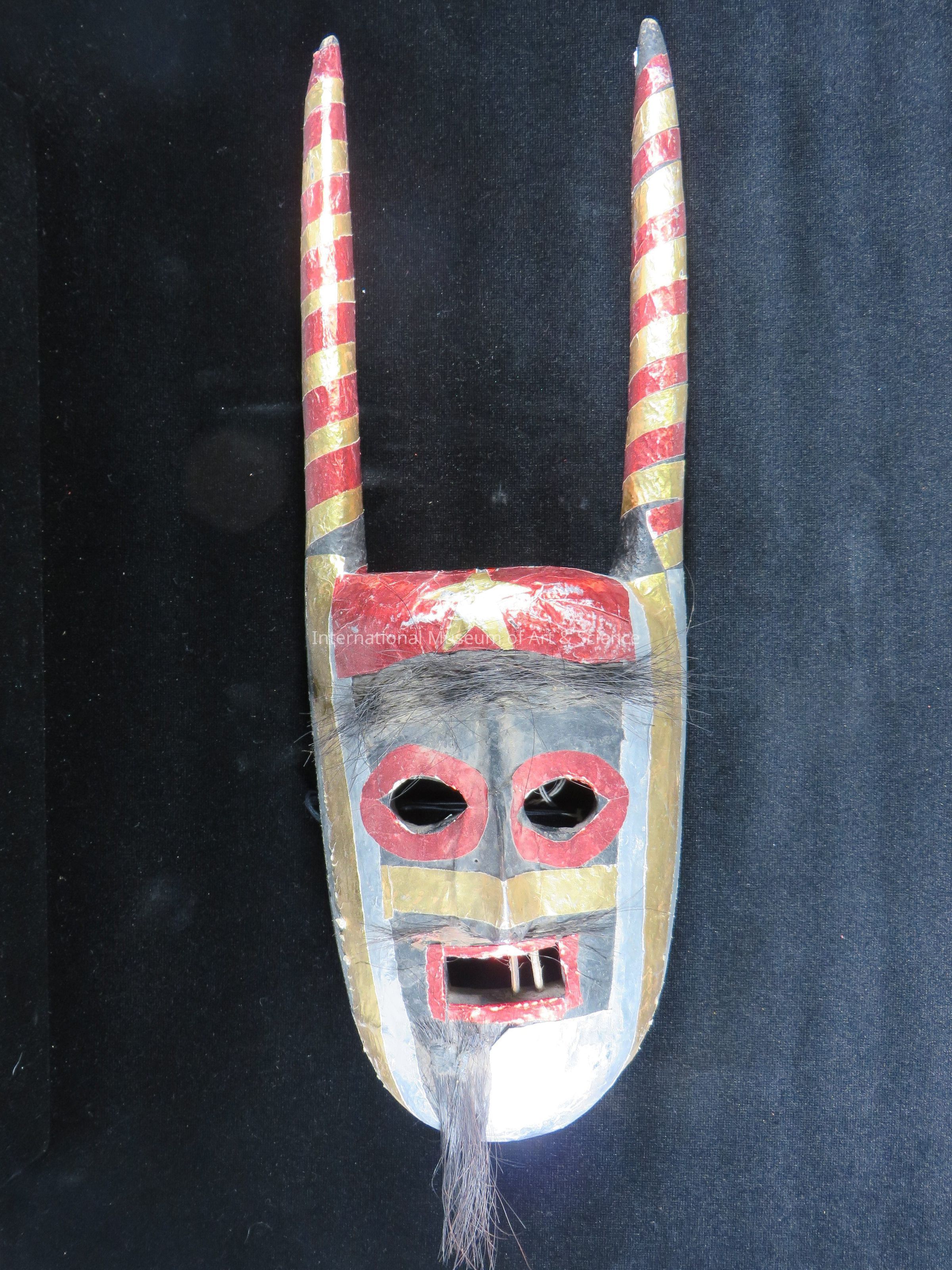 Mask. Black face; eyes and mouth outlined in red foil; slver and gold on face; open mouth - two wooden bars for teeth. Horsehair eyebrows and goatee (right side of mask only). Horns covered with red and gold foil. Star with face in center of forehead.Dimensions