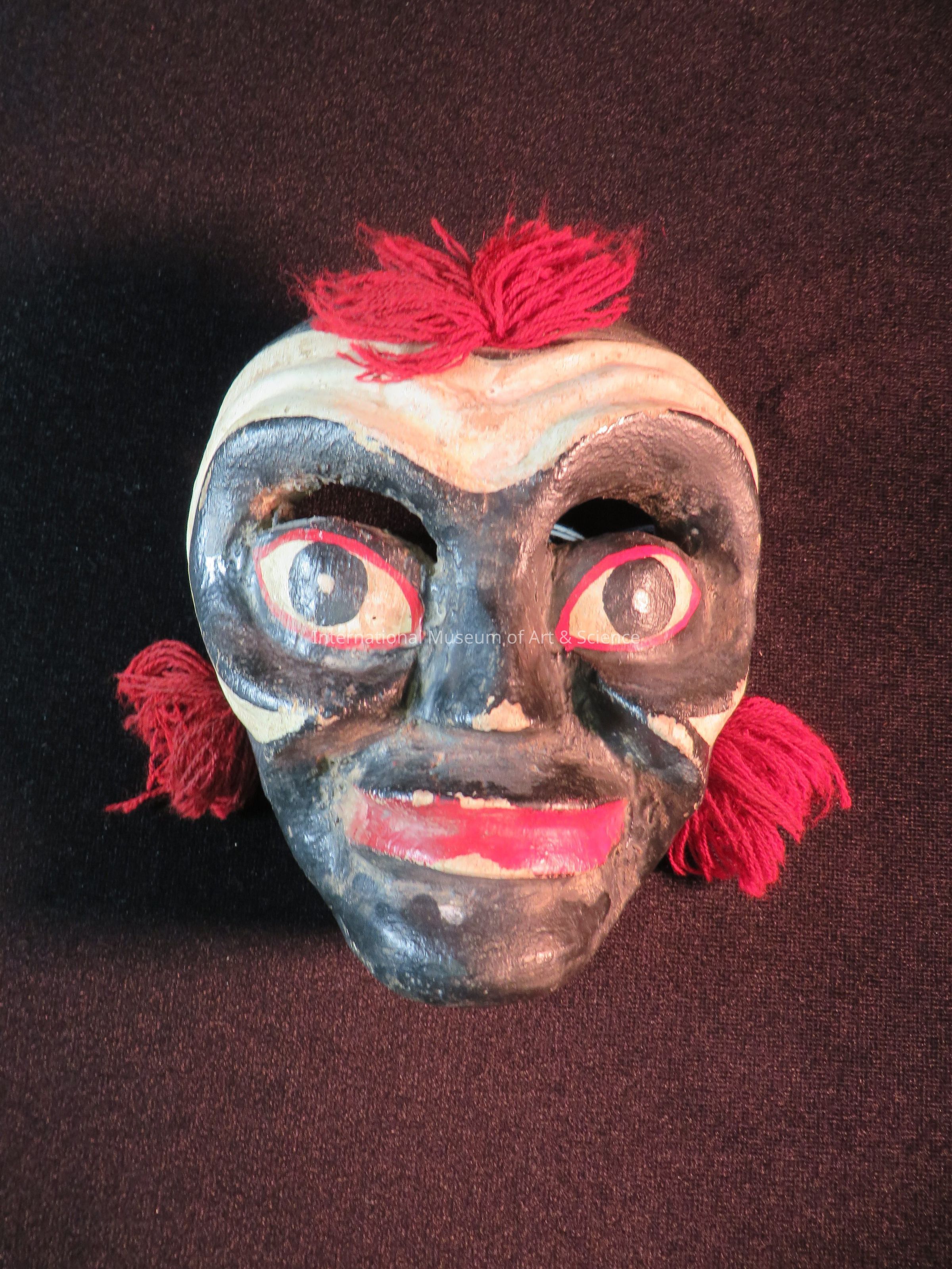 (Negrito) Mask. Black face, eyes, outlined in red; white paint on brow and cheeks; red yarn; openings above eyes.Dimensions