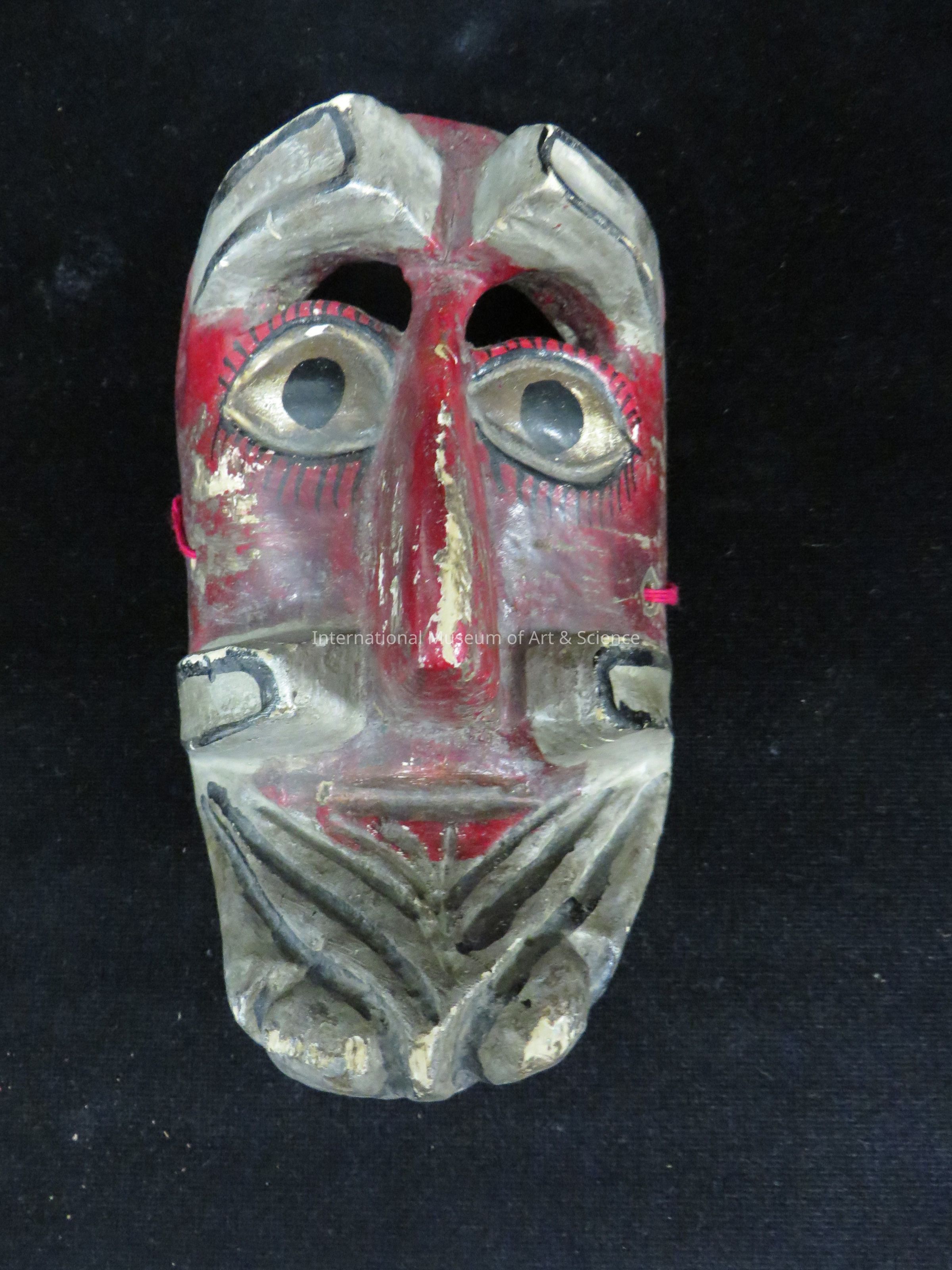 Mask. Red face, eyebrows, moustache and goatee silver outlined in black; openings above painted eyes for wearer.Dimensions