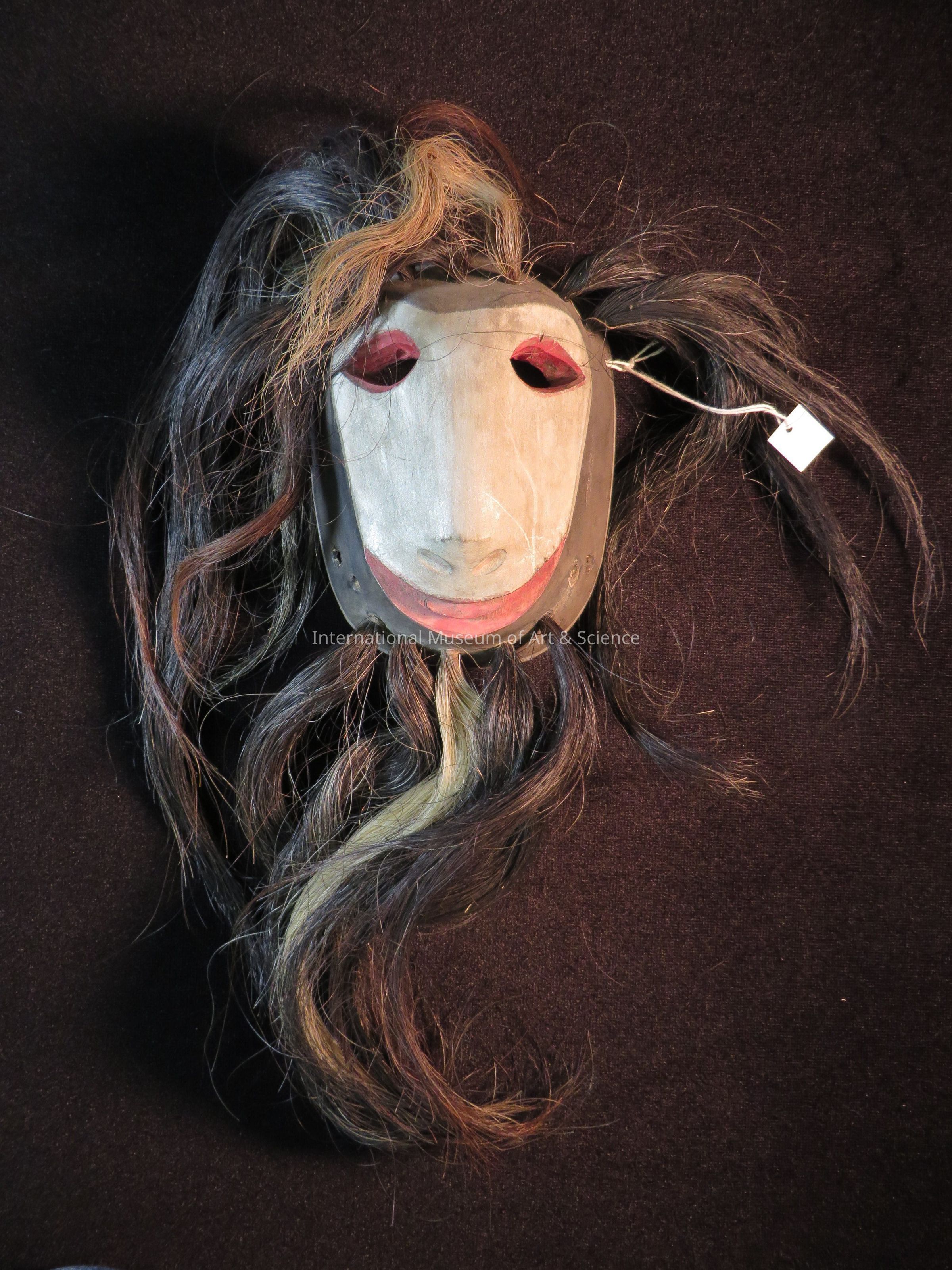 Mask. Mayo Pascola character. Carved mask painted white with monkey-like face features; open eye slits, oval eyes red painted mouth; flat carved nose with protruding holes as nostrils; black rim with strands of animal hair black, yellow and grey animal hair.Artwork Details
