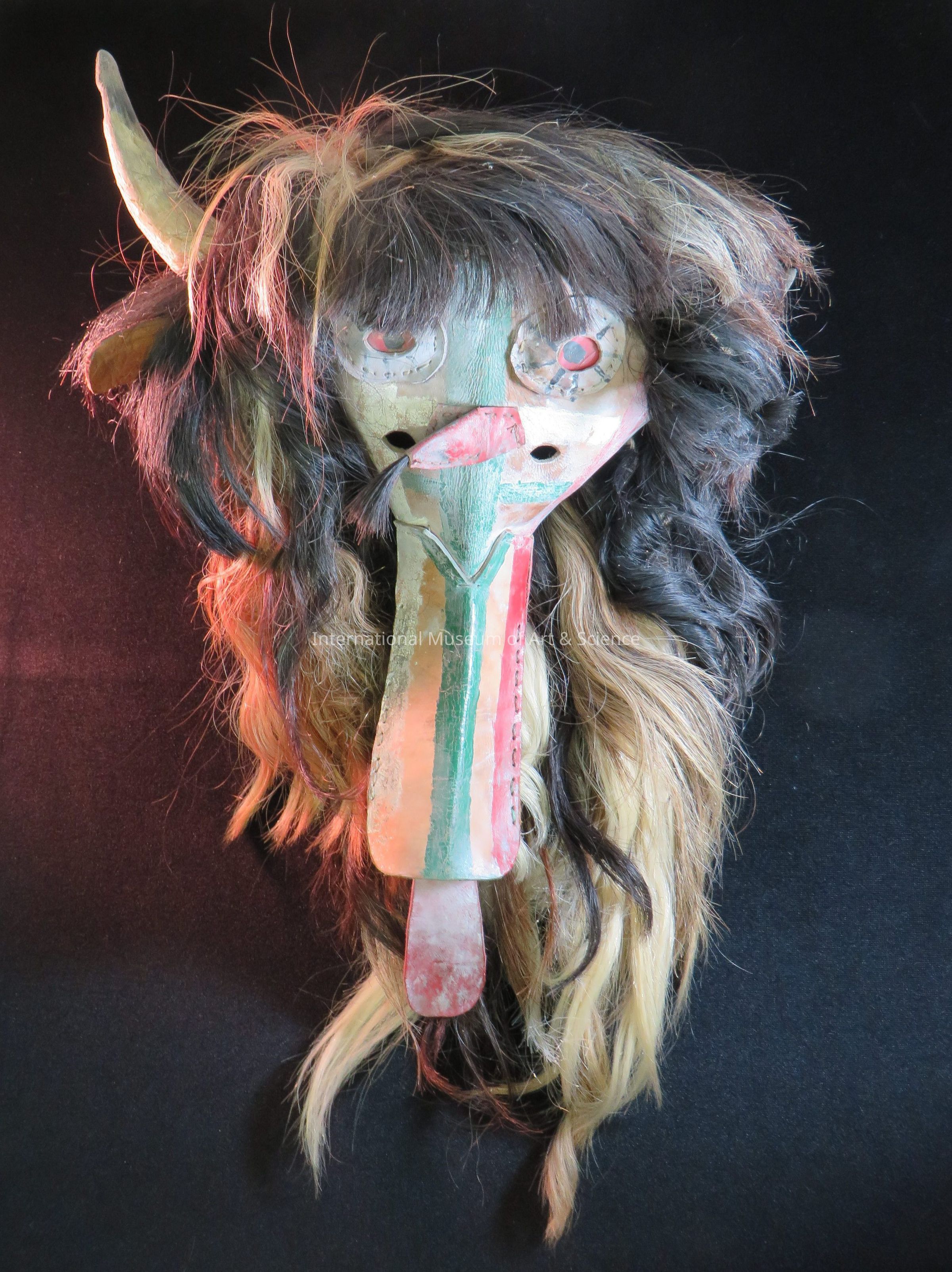 Mask. Devil with long nose, protruding tongue; leather painted with black, red, white and green stripes; red leather tongue; pointed horns on head; mask covered with black, brown, white and beige assorted animal hair.Artwork Details