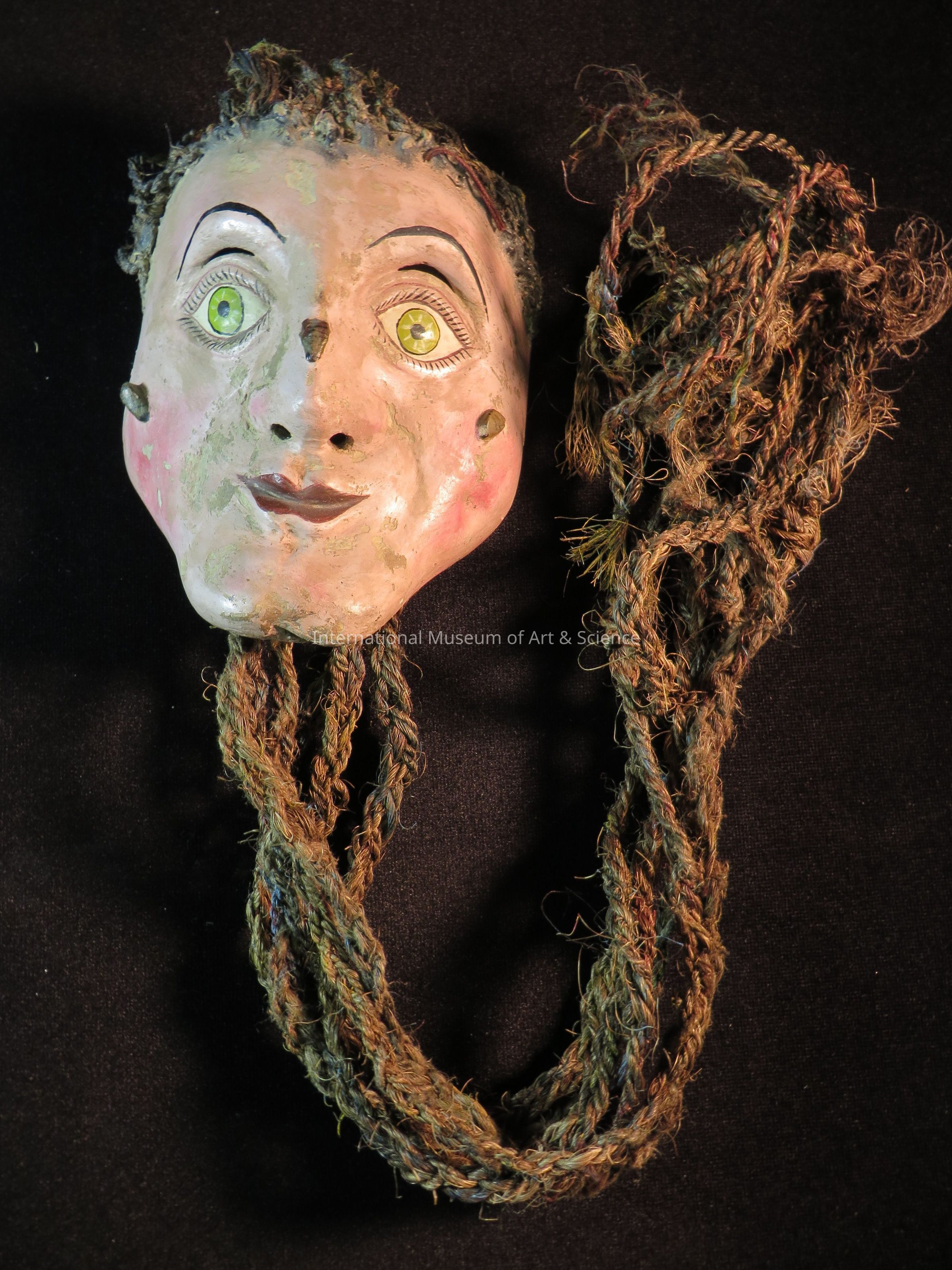 Mask. The mask was created in the 1930s while the hair was added later in 1965. The mask is carved wood, finely featured face with bees in relief on cheeks, nose; long braided ixtle hair-tiny braids in row across top of head; yellow painted eyes.Dimensions