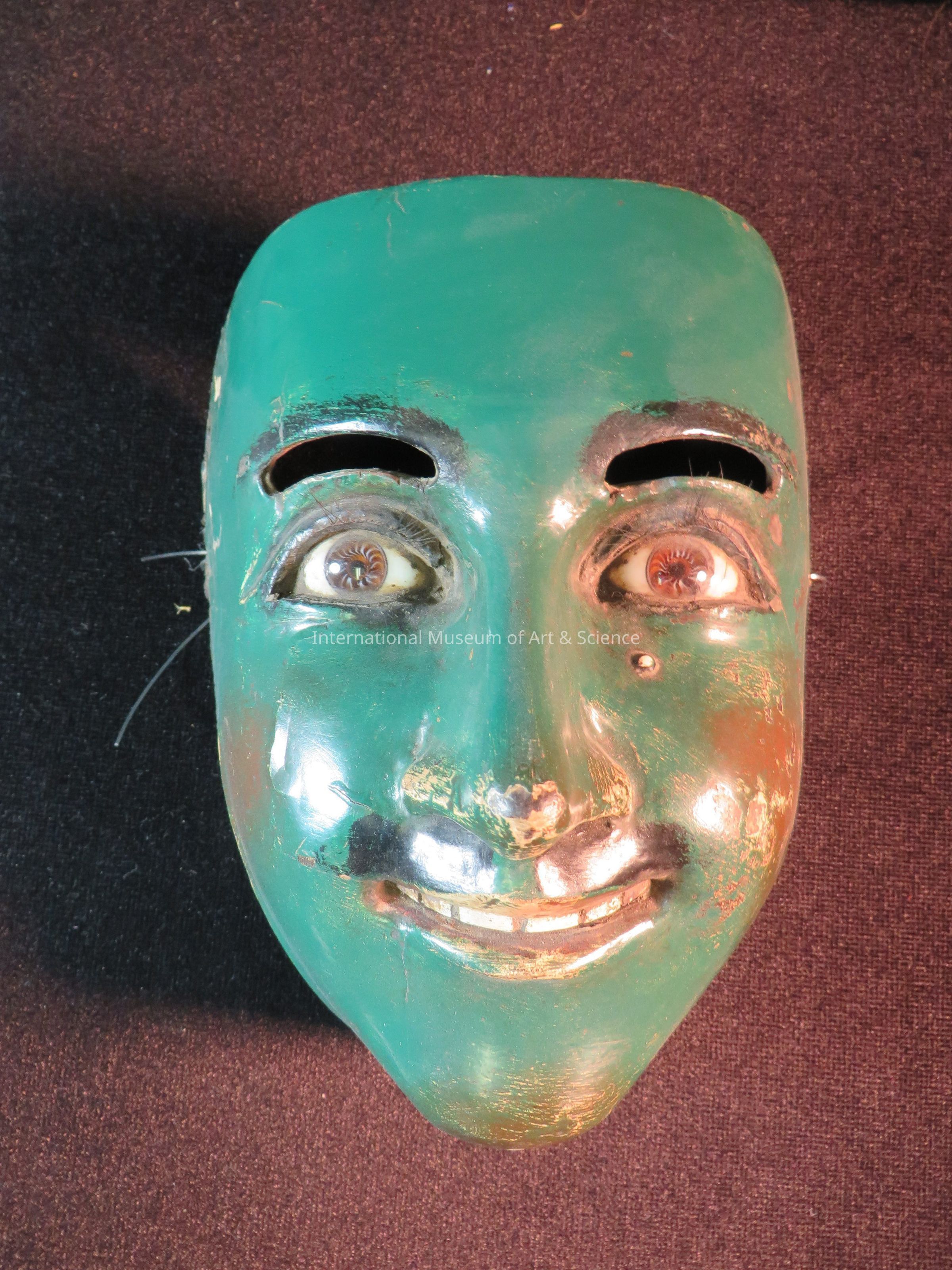 Male Mask. Mask painted green; brown and white glass eyes; male face smiling exposing white carved teeth.Artwork Details
