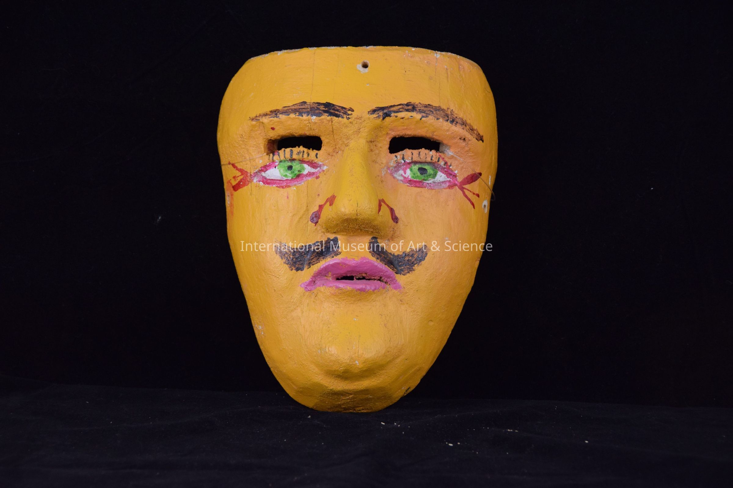 A wood carved mask. The mask is of a man's face. The face is painted a yellow/orange with pink lips, green eyes, and a brown moustache. There are slits carved between the eyes and eyebrows for the wearer to see throught, along with a slit betwwen the lips. The mask is of a Tlacololeros character.Artwork Details
