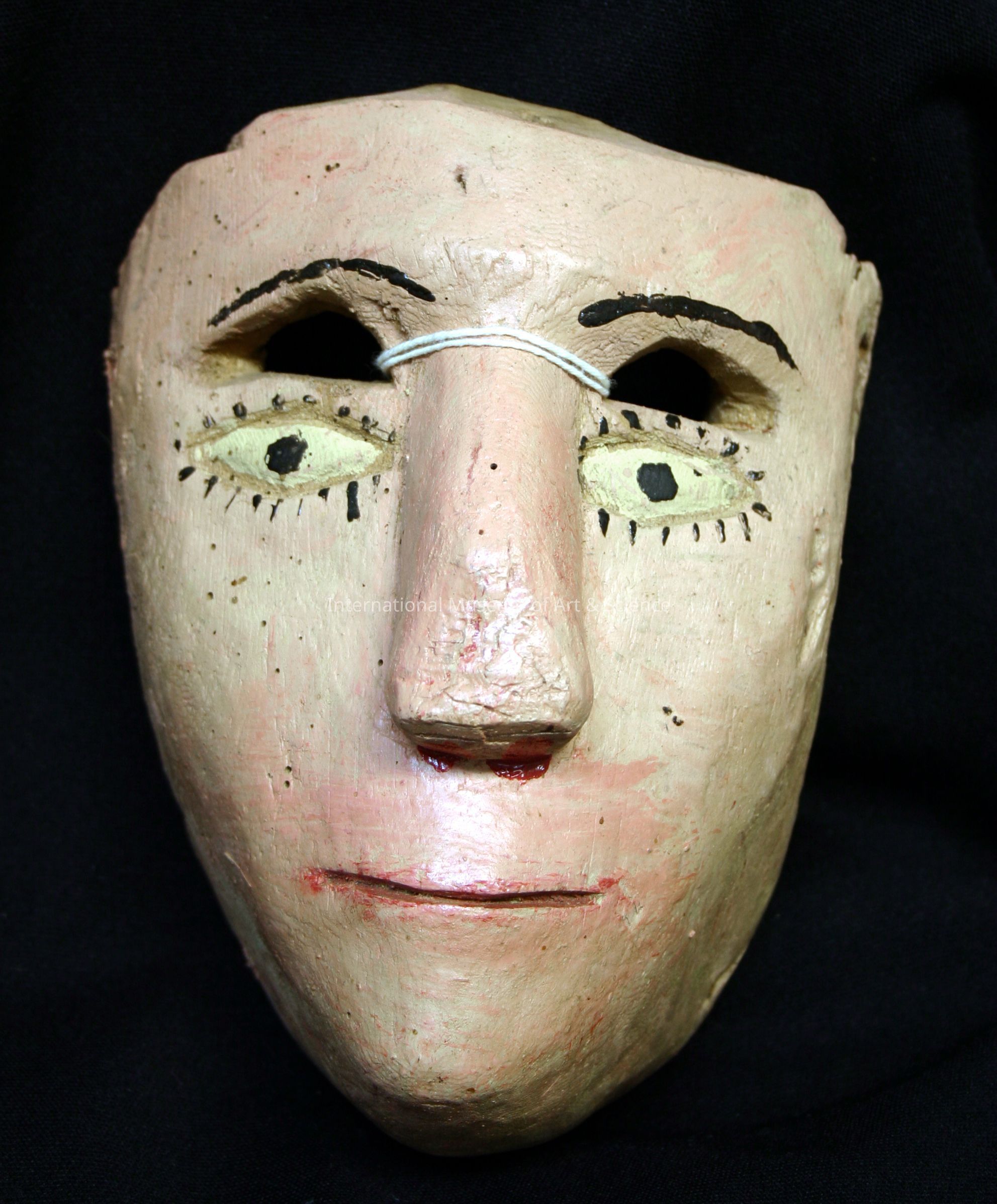 Mask of the Gauchupines. Peachy flesh color mask; black eyebrows; yellow with black oval eyes; linear carved horizontal mouth; red painted nostrils; overall simple mask.Made/Created