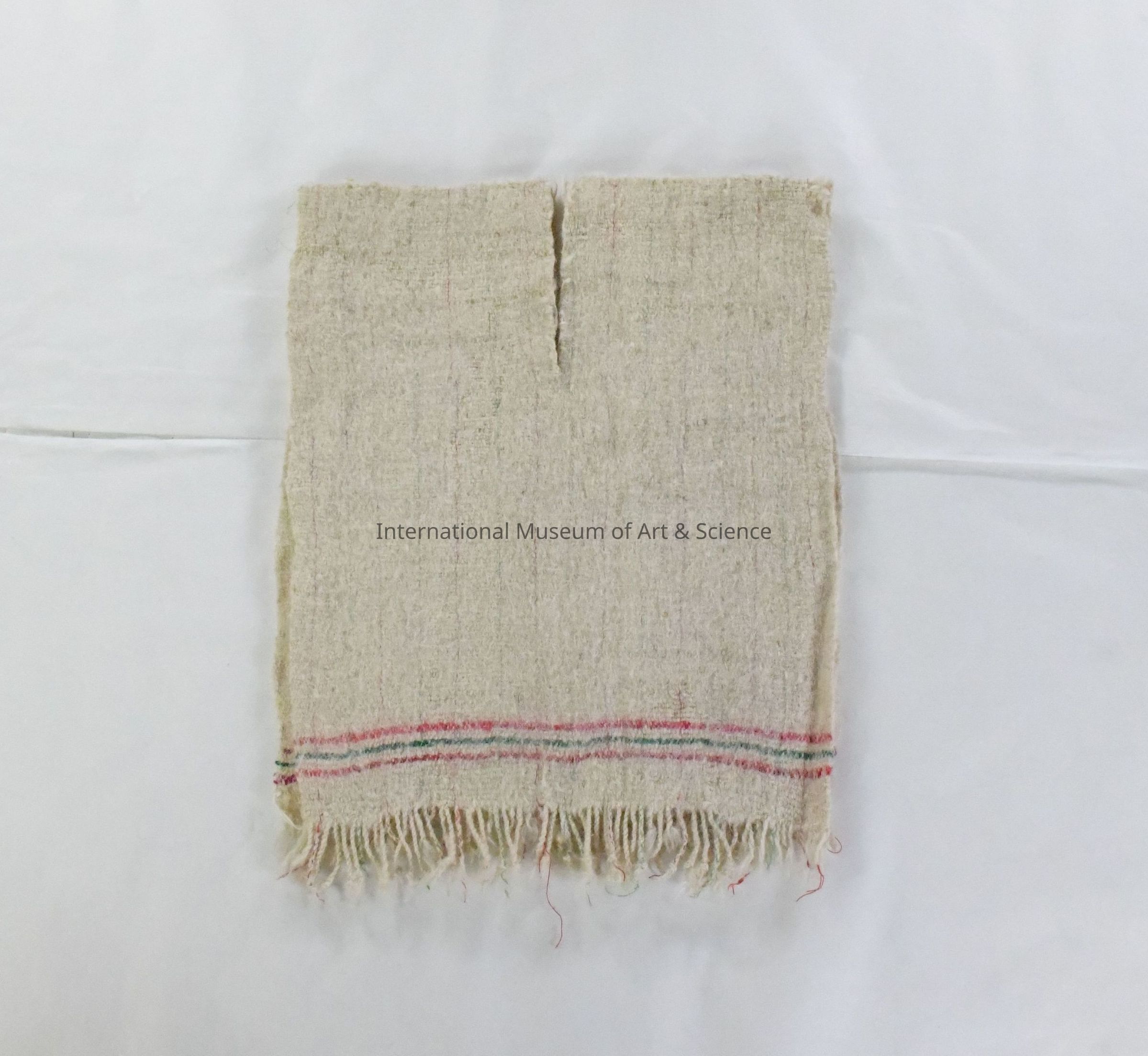 This child-sized wool tunic is composed of handspun, undyed sheep's wool, woven in a twill structure on a backstrap loom. The garment consists of a single rectangular panel folded at the shoulders, with an opening slit at the center for the neck and sides. Both horizontal ends feature fringe left from the unwoven warp ends, twisted slightly to avoid unraveling. A set of three narrow stripes—two red and one green—made from commercial yarn is inserted near both ends of the tunic, providing a restrained decorative element. The texture is dense with visible evidence of high-quality spinning and consistent loom tension. The wool has developed a smooth patina from wear and finishing.Ethnography