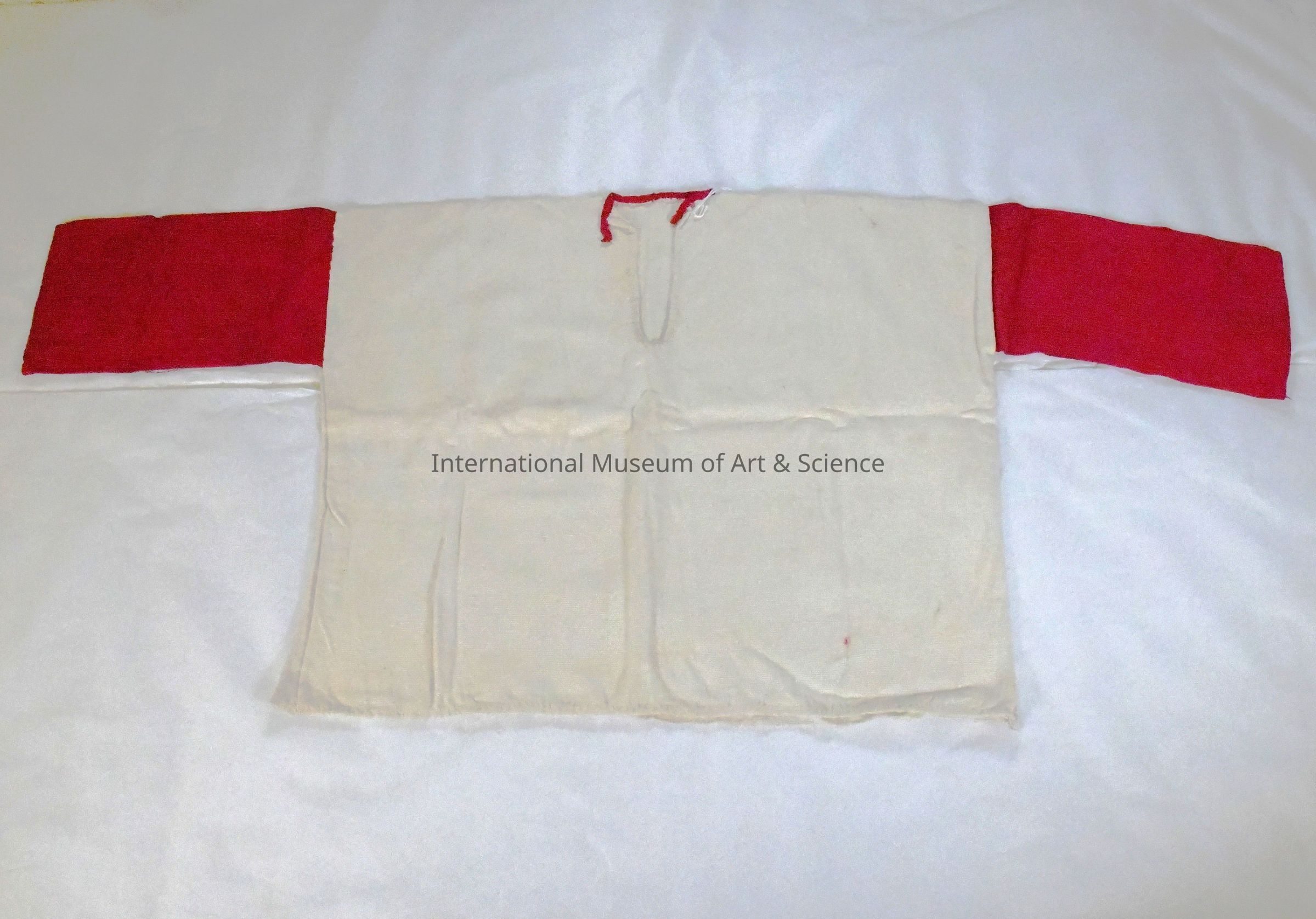 The shirt is made from two woven cotton panels: one red and one off-white. Each panel has three selvage edges and was cut and tailored to assemble the shirt. The red panel is divided and stitched to form the sleeves, and the white panel makes up the main body. A vertical slit at the neckline is reinforced with bright red thread in a decorative hand-stitched border. The lower hem is also hand-finished. The garment is unembellished except for its color-blocked construction and red embroidery, with a straight, boxy cut typical of traditional men’s shirts in the region.Ethnography
