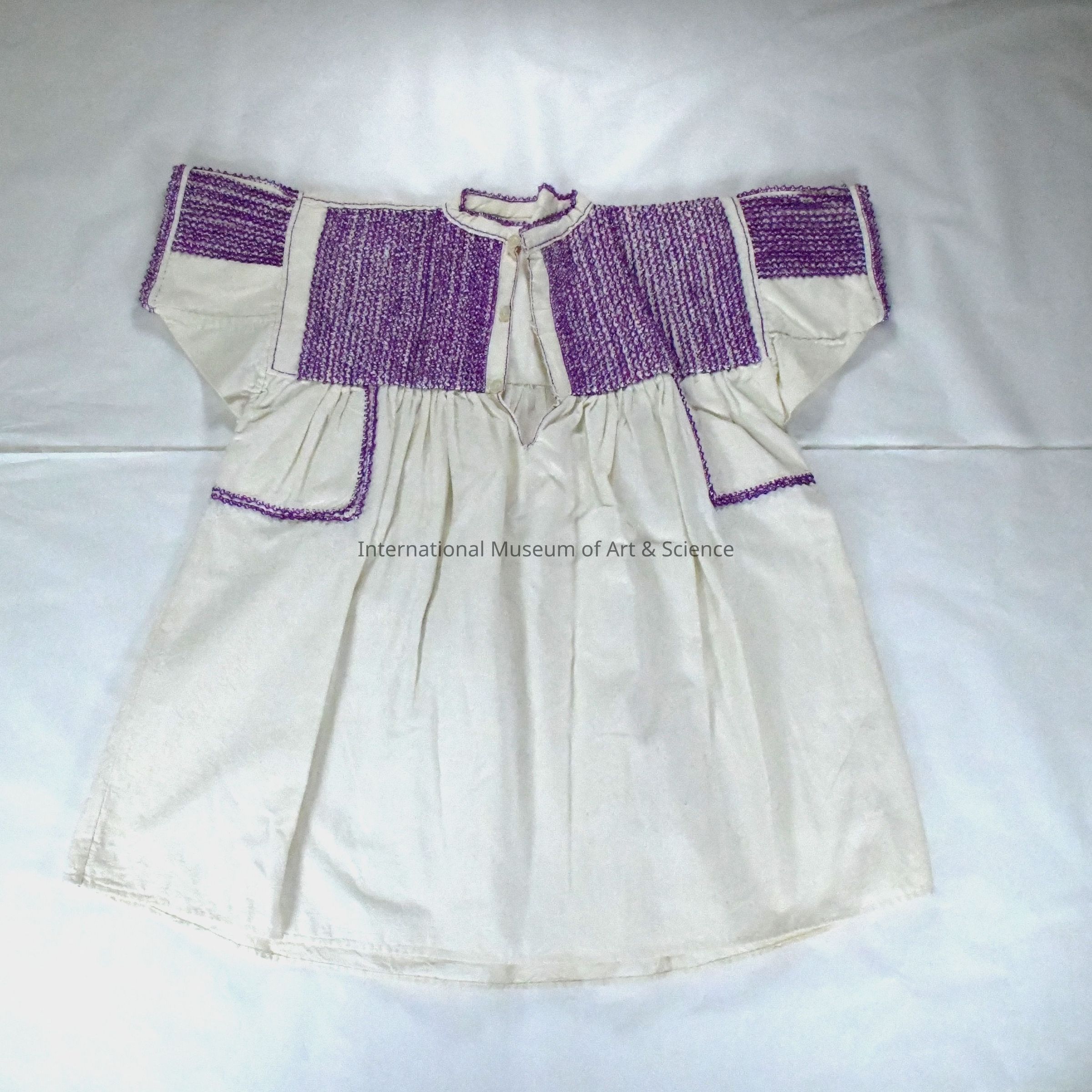 This blouse's lightweight construction and breathable manta fabric make it ideal for daily wear in the highland sun, while the embroidery and pleating add decorative flair and cultural identity.Ethnography