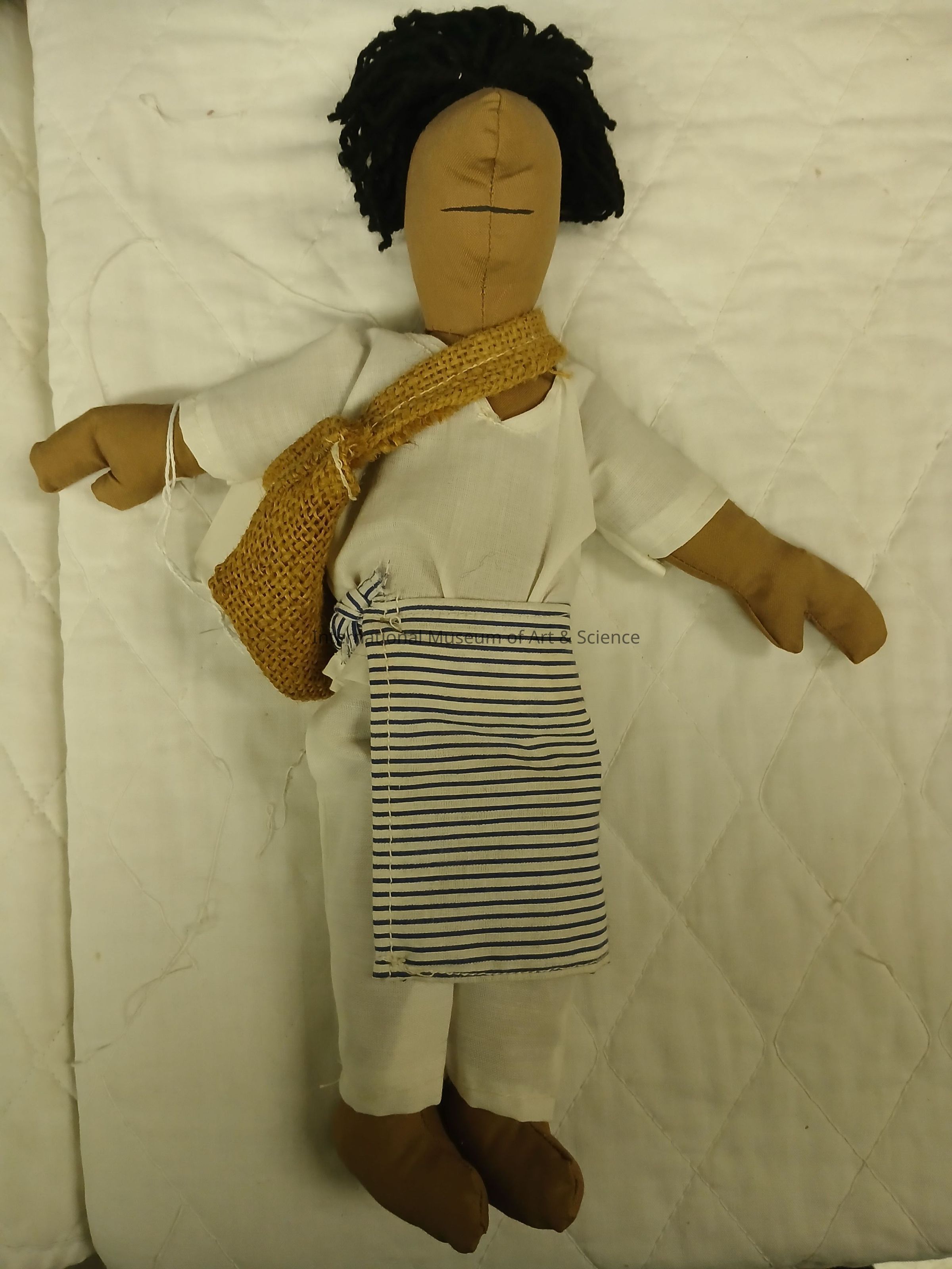 A male doll dressed in a traditional Yucatan men's huipil with dark painted eyes, a cross body bag and coiled hair.