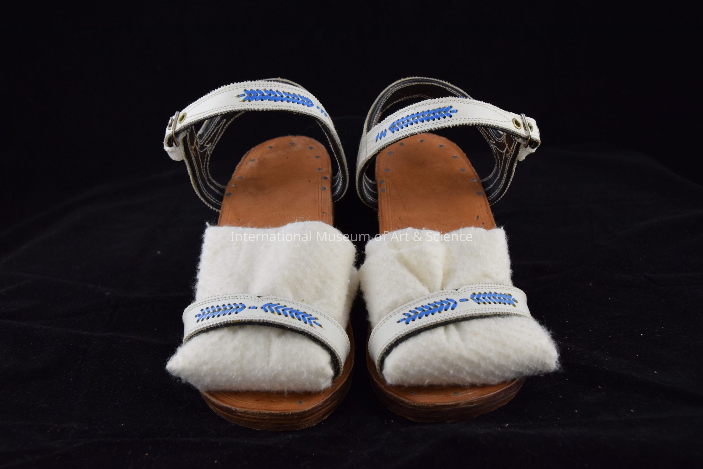 Men's Huaraches/Men's Sandals. Pair of white "huaraches" decorated with blue fish scale wearing on white; brown natural leather forms nailed to black rubber tire soles; silver metal straps attached machine sewn.Artwork Details