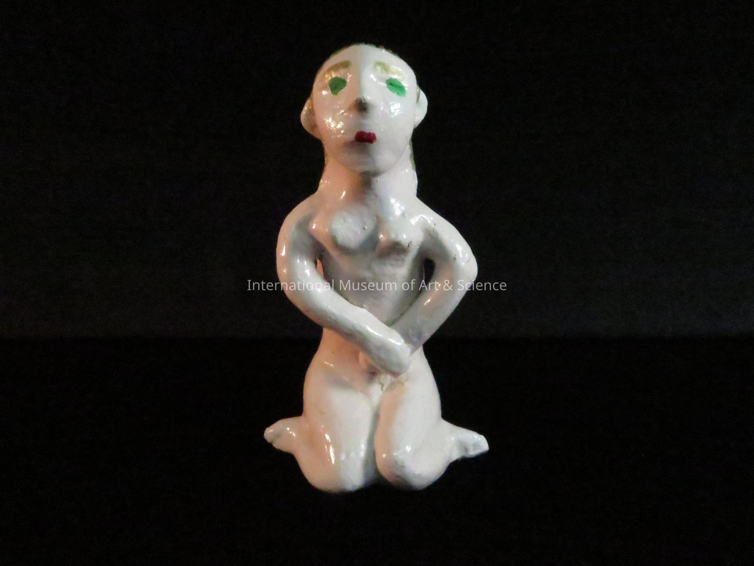 A figurine of a nude woman. The figurine is made from clay and the details have been painted on. The woman's pink is painted a fleshy peach, she has green eyes, red lips, and golden hair. She may be a mermaid. She is seated with legs folded and arms together at the waist;Made/Created