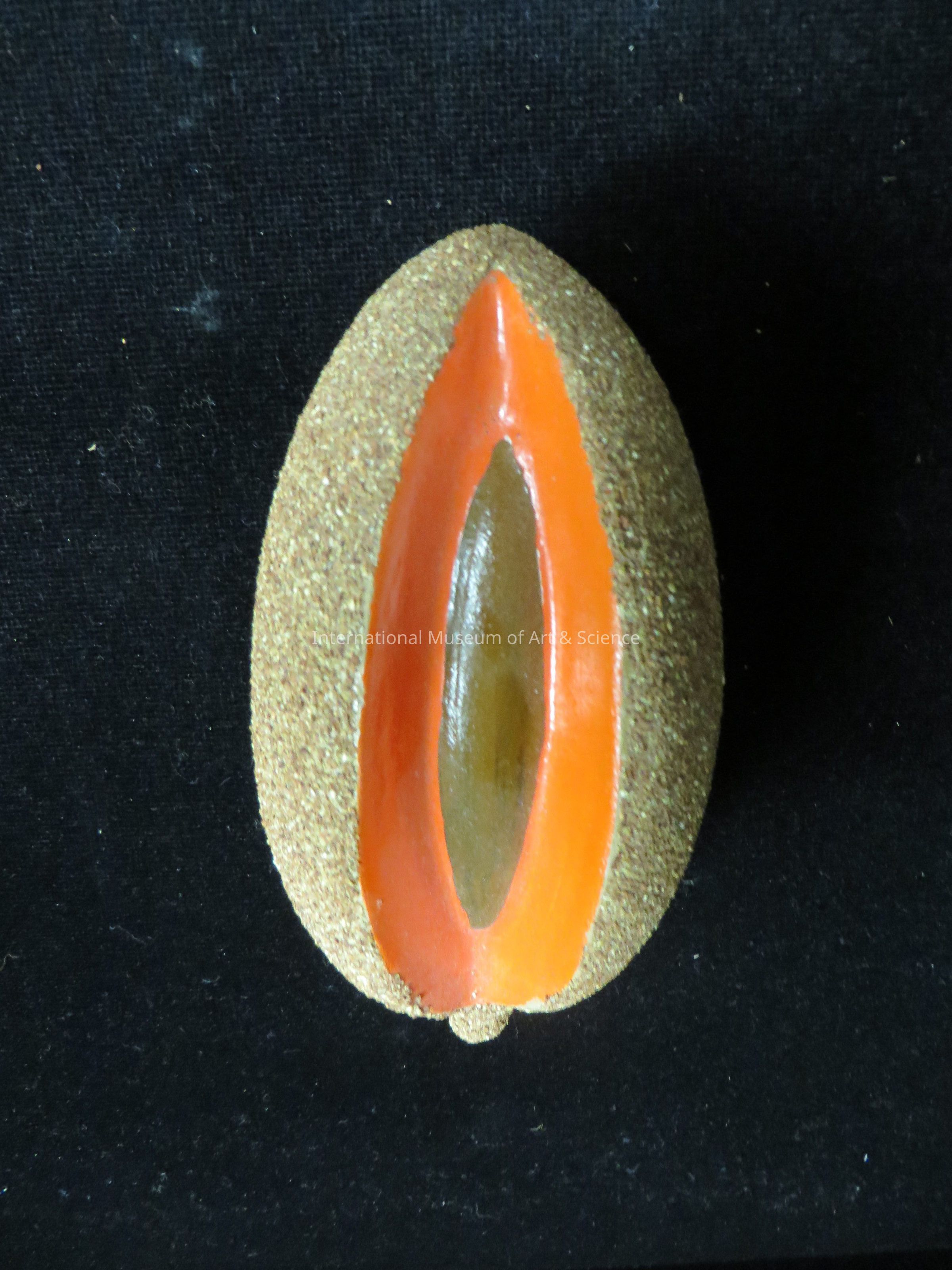 A ceramic mamey sapote. The piece is painted in bright orange with olive green details. The outside of the fruit is covered with sand to give it a rough texture. The piece is part of a set. The set shows a woman with a bowl on her head filled with fruit.Made/Created