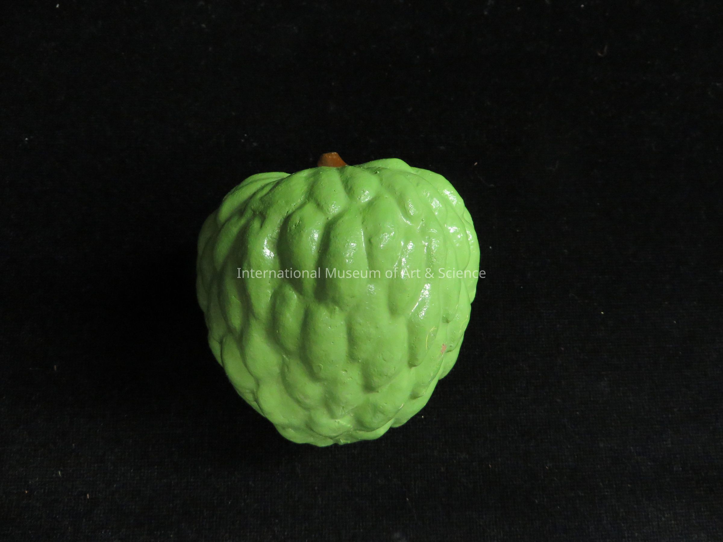 A ceramic chirimoya fruit. The piece is painted in bright green with brown details. The piece is part of a set. The set shows a woman with a bowl on her head filled with fruit.Made/Created